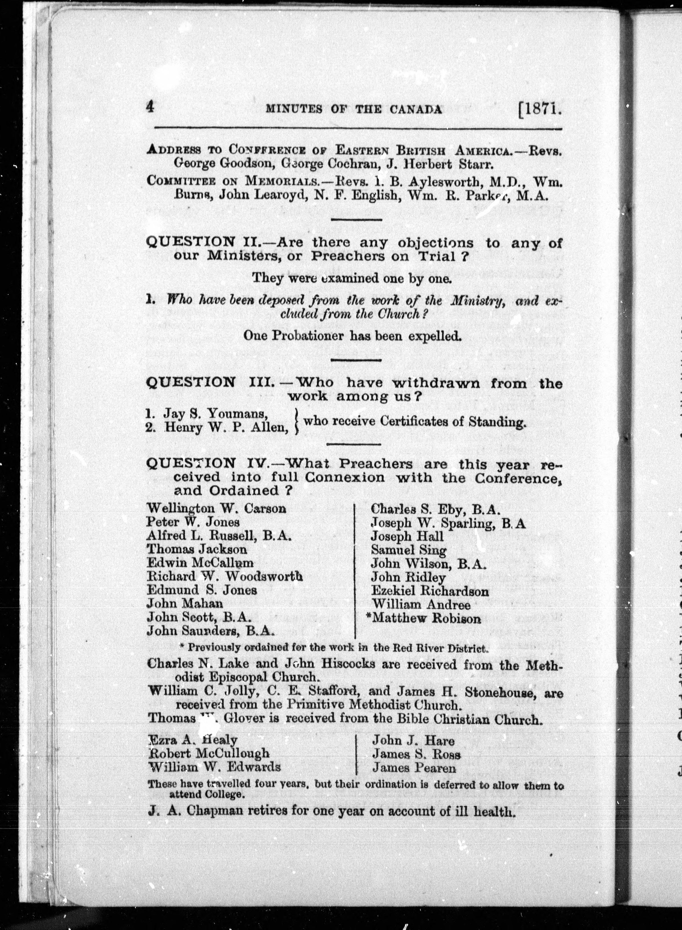 Minutes of the forty-eighth annual conference of the Wesleyan Methodist Church in Canada : held in the Bridge Street Church, town of Belleville, Ont., begun on Wednesday, June 7th, and concluded on Friday, June 16th, 1871 : Forty-Eighth (1871)