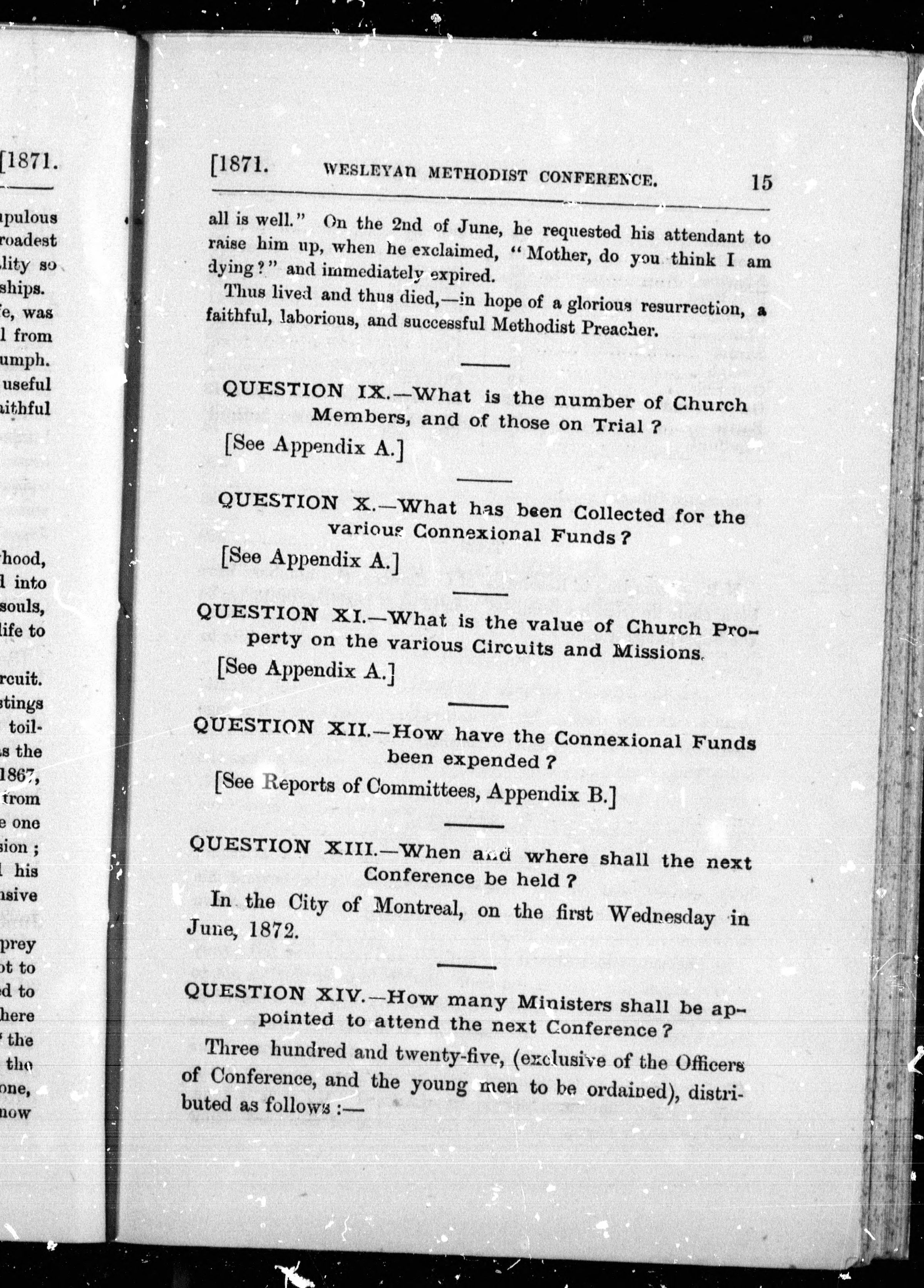 Minutes of the forty-eighth annual conference of the Wesleyan Methodist Church in Canada : held in the Bridge Street Church, town of Belleville, Ont., begun on Wednesday, June 7th, and concluded on Friday, June 16th, 1871 : Forty-Eighth (1871)
