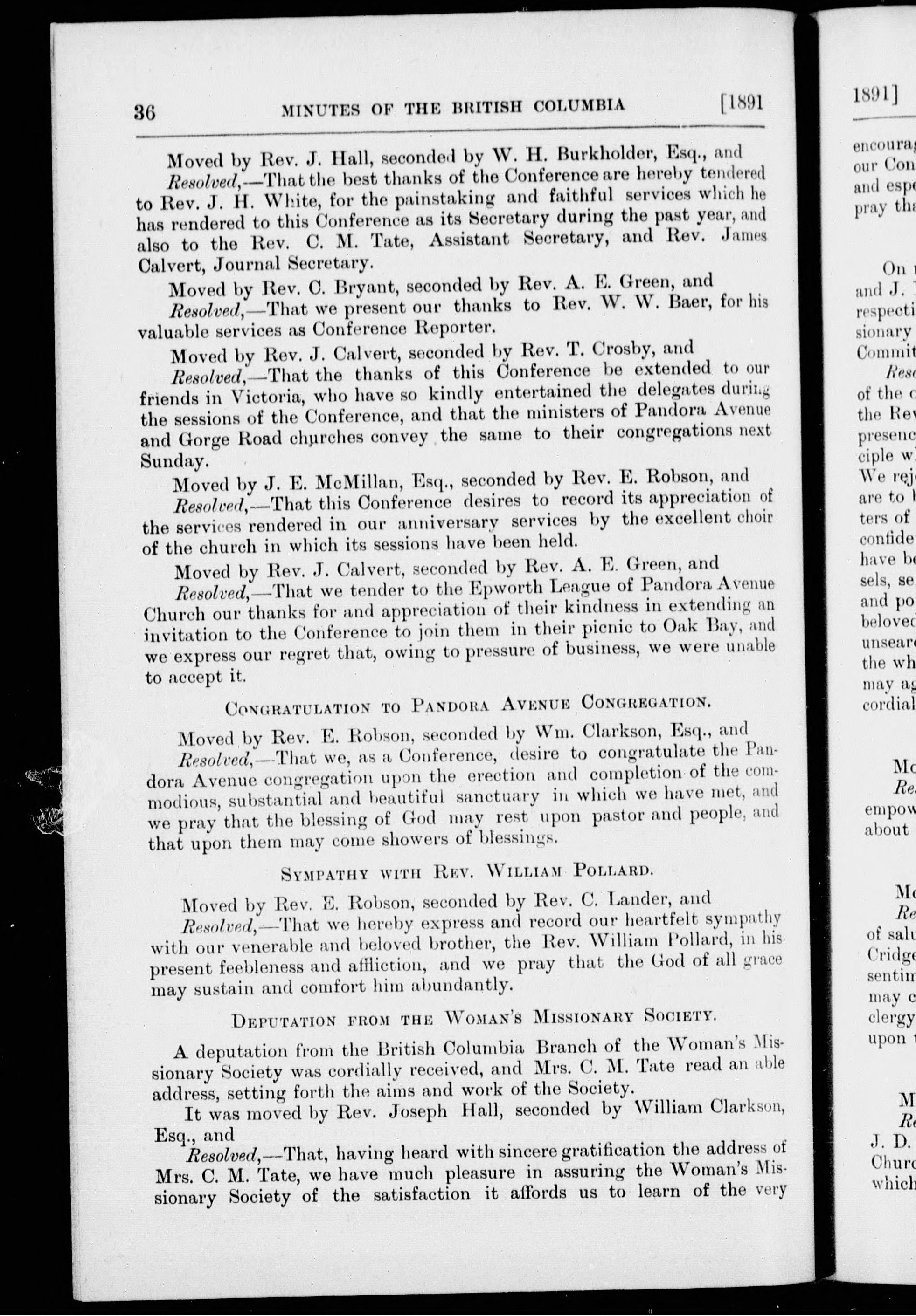 - Minutes of the proceedings of the fifth session of the British Columbia Annual Conference of the Methodist Church : held in Pandora Avenue Methodist Church, Victoria, B.C., from Wednesday June 20th, to Tuesday, June 26th, 1891 : Fifth (1891)