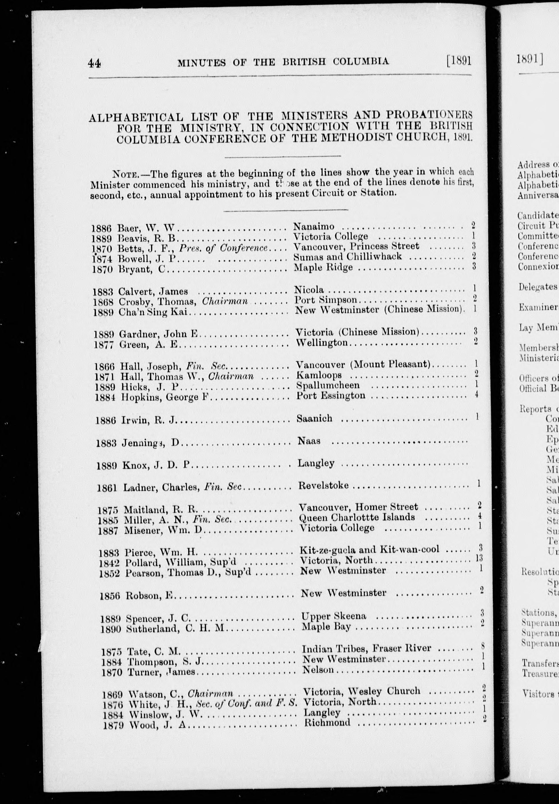 - Minutes of the proceedings of the fifth session of the British Columbia Annual Conference of the Methodist Church : held in Pandora Avenue Methodist Church, Victoria, B.C., from Wednesday June 20th, to Tuesday, June 26th, 1891 : Fifth (1891)