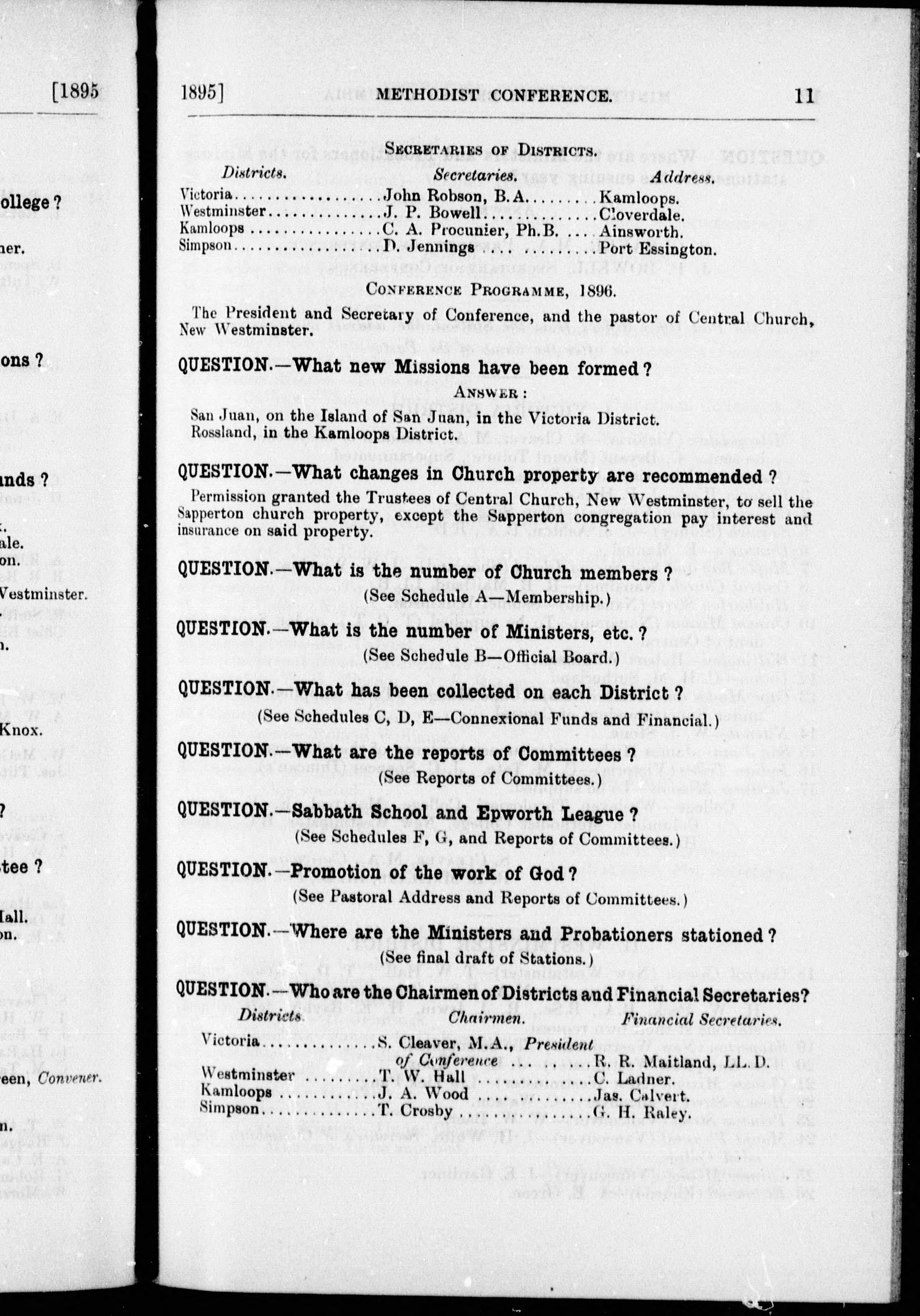 Minutes of the proceedings of the ... session of the British Columbia Conference of the Methodist Church : Minutes of the proceedings of the ninth session of the British Columbia Annual Conference of the Methodist Church : held in Metropolitan Methodist Church, Victoria, B.C., commencing Wednesday, May 8th and continuing until Wednesday, May 15th, 1895 : Ninth (1895)