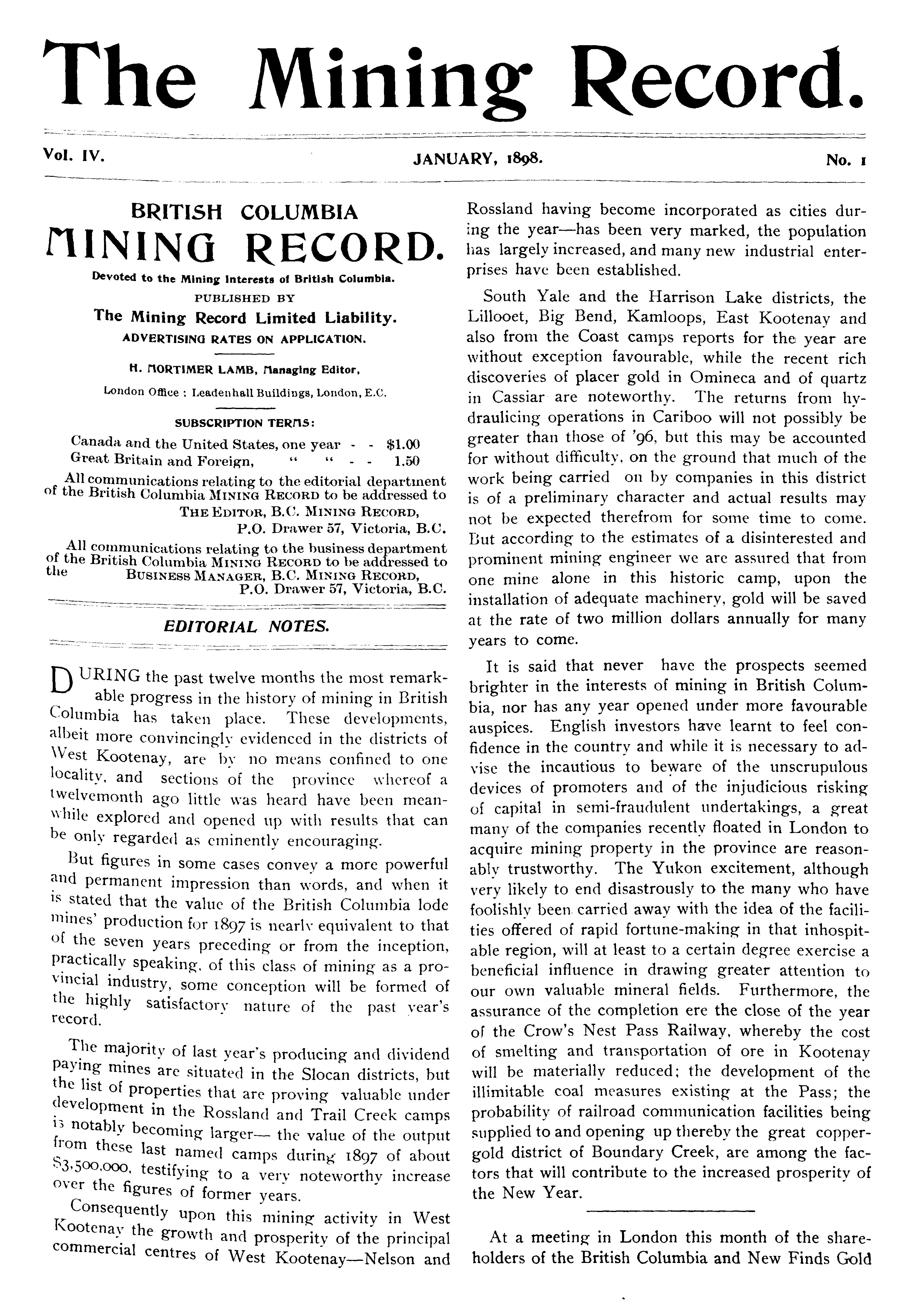 The mining record. : The mining record : Vol. 4, no. 1 (Jan. 1898)