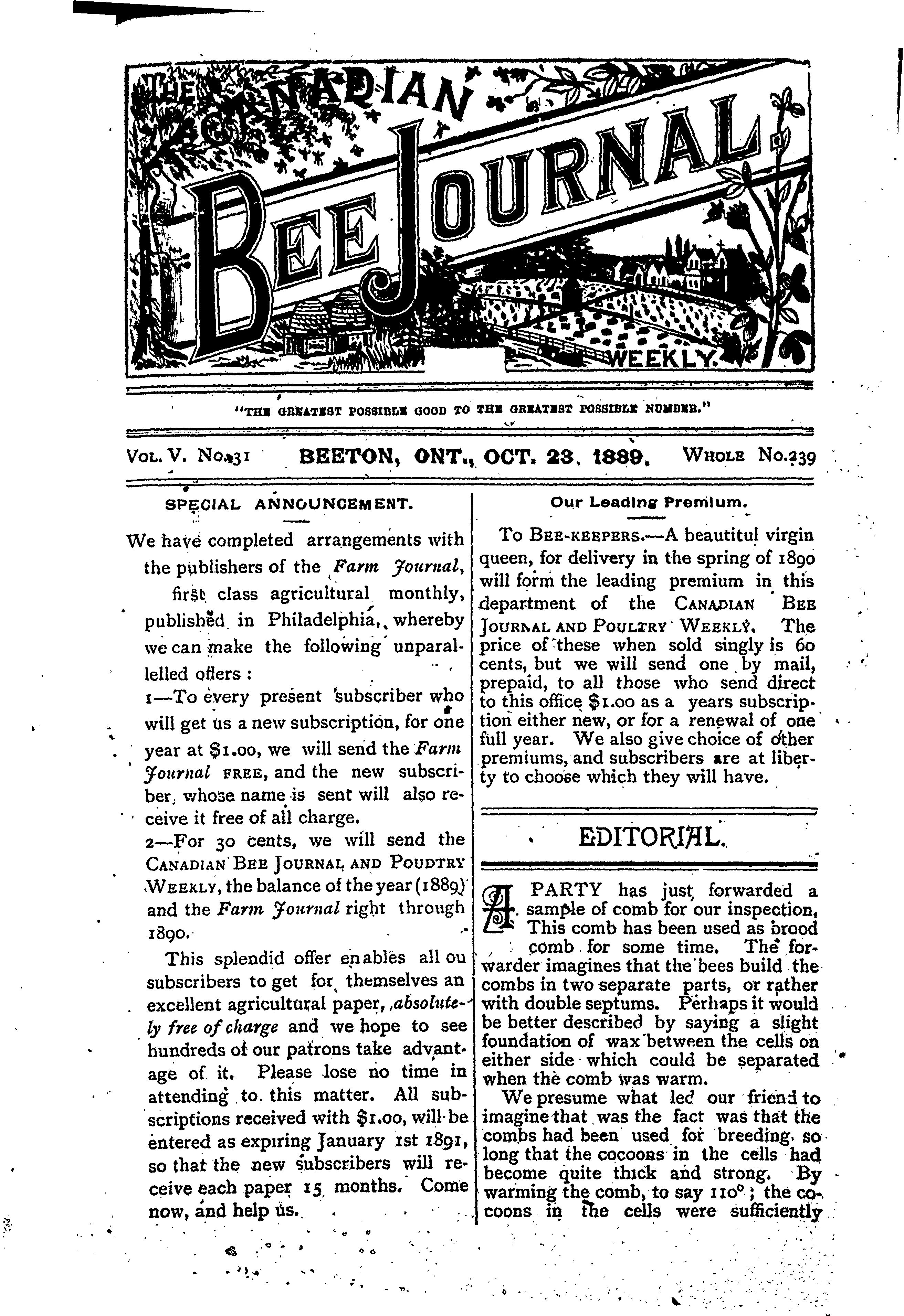 The Canadian bee journal [Vol. 5, no. 31 (Oct. 23, 1889)]