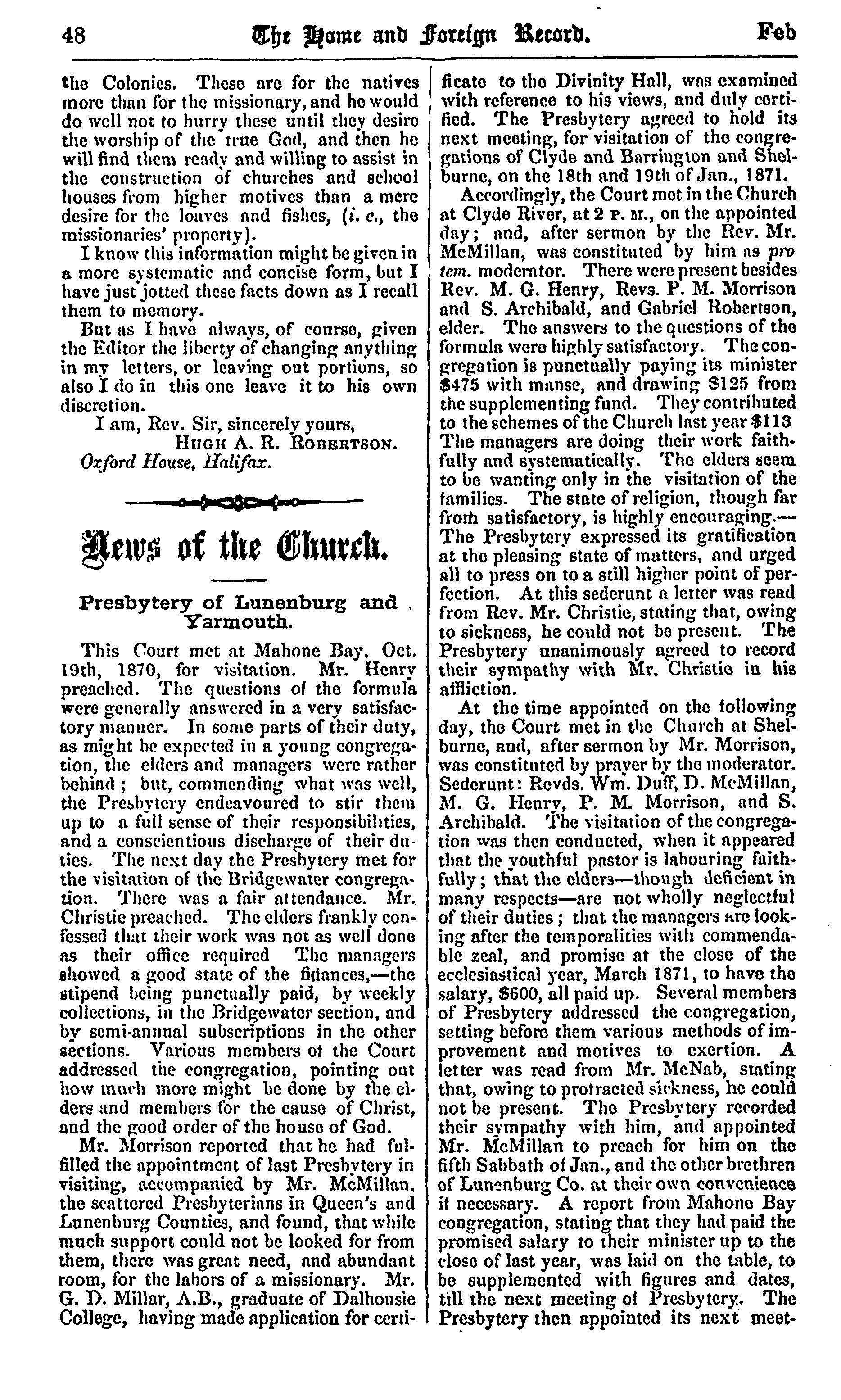 - The home and foreign record of the Presbyterian Church of the Lower Provinces of British North America [Vol. 11] (Feb. 1871)]
