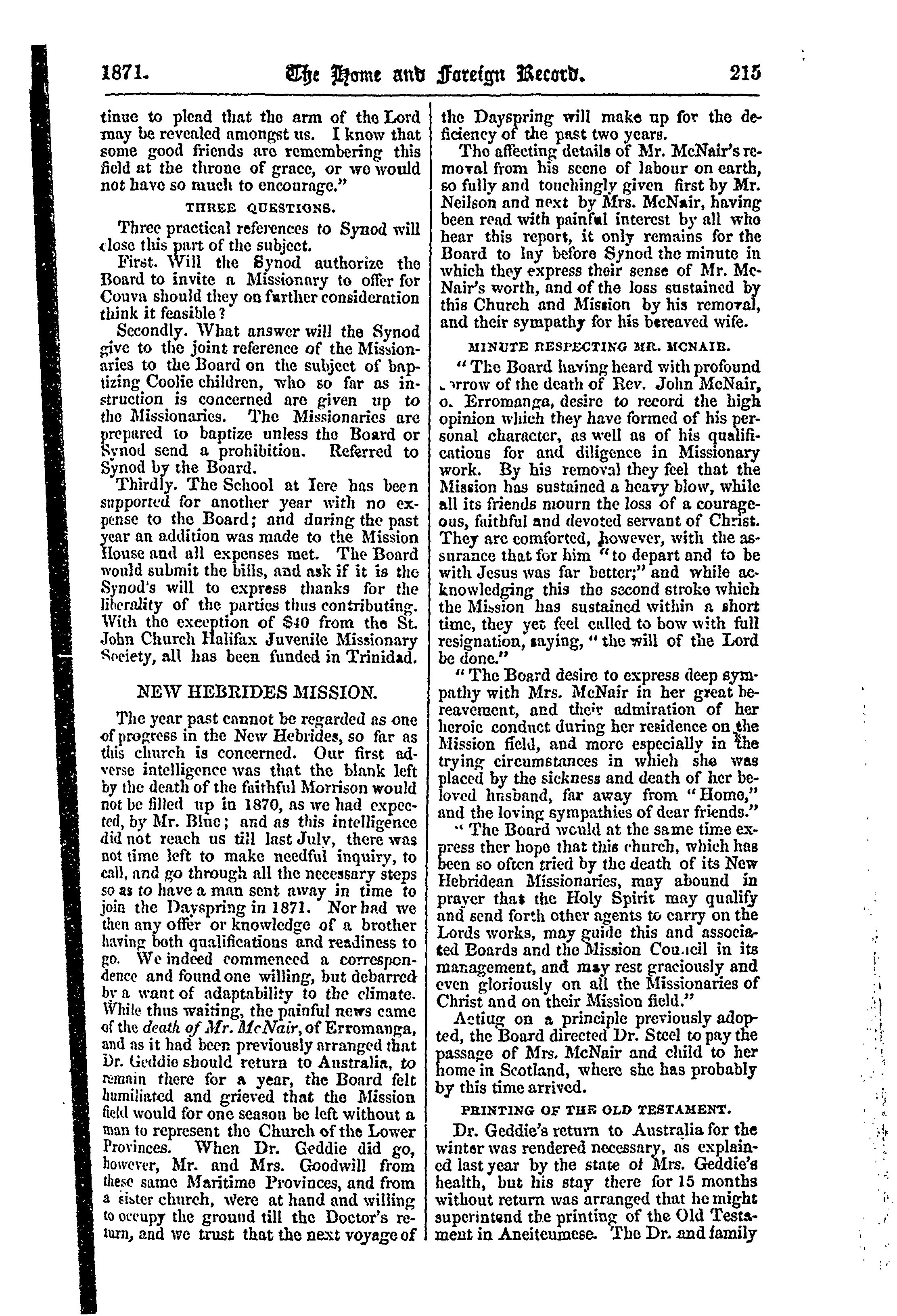 - The home and foreign record of the Presbyterian Church of the Lower Provinces of British North America [Vol. 11] (Aug. 1871)]
