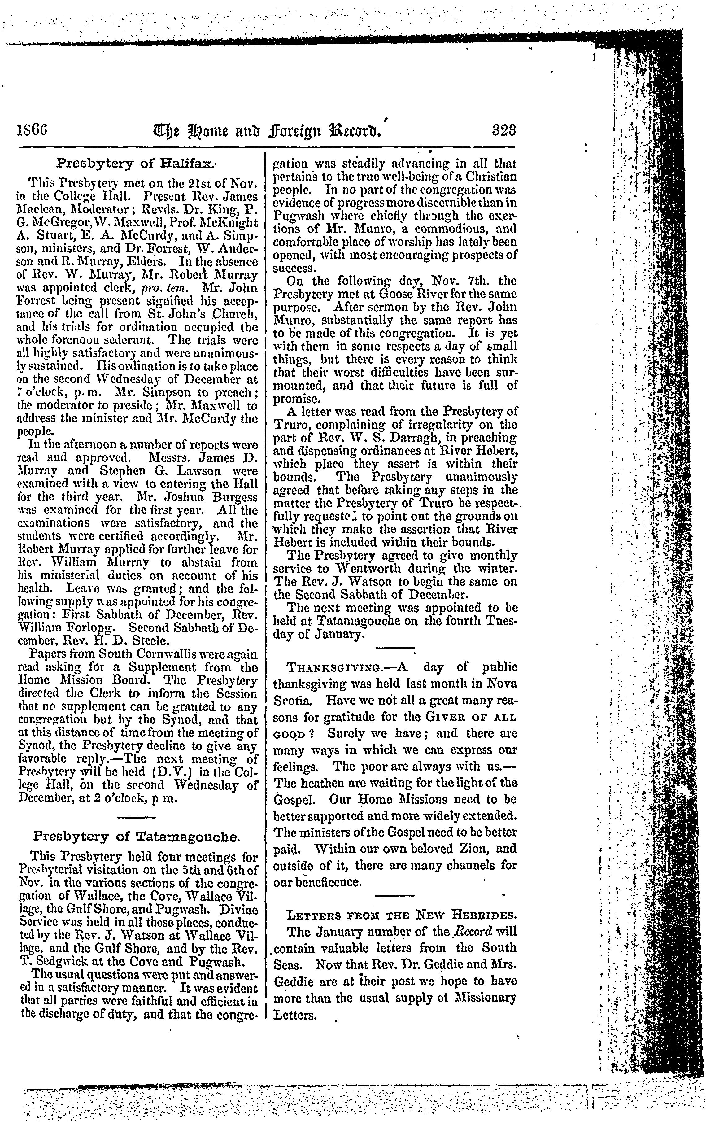 - The home and foreign record of the Presbyterian Church of the Lower Provinces of British North America [Vol. 6] (Dec. 1866)]