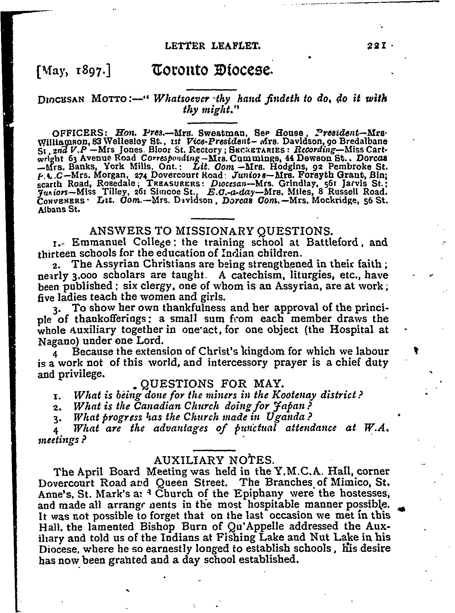 - Letter leaflet of the Woman's Auxiliary to the Board of Domestic and Foreign Missions of the Church of England in Canada [May 1897]