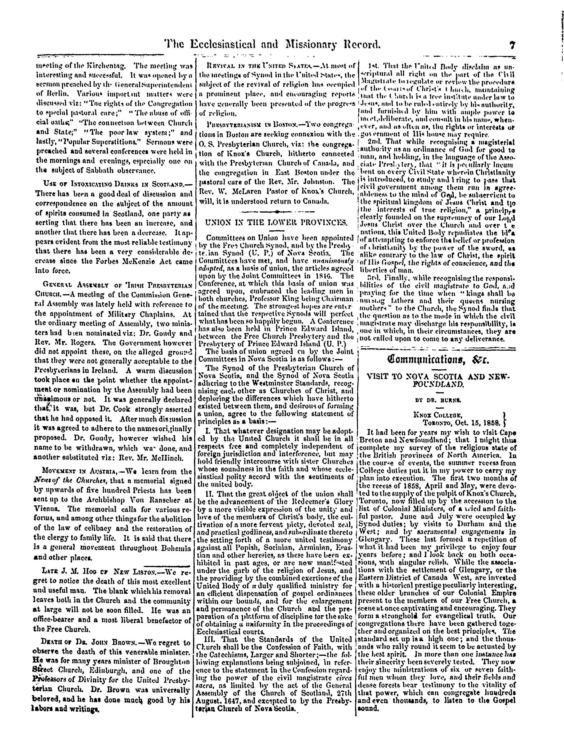 - The ecclesiastical and missionary record for the Presbyterian Church of Canada [Vol. 15, no. 1 (Nov. 1858)]