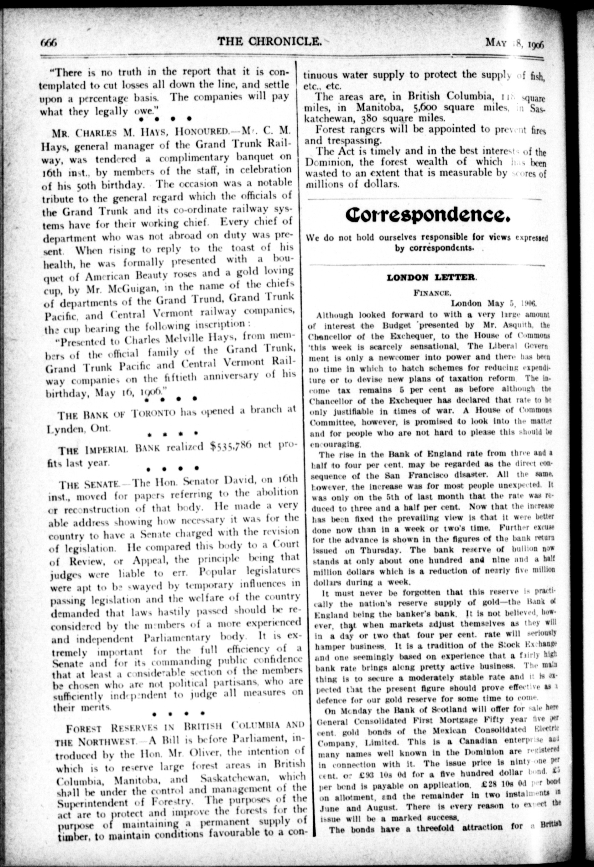 The chronicle : Vol. XXVI, No. 20 (May 18, 1906)