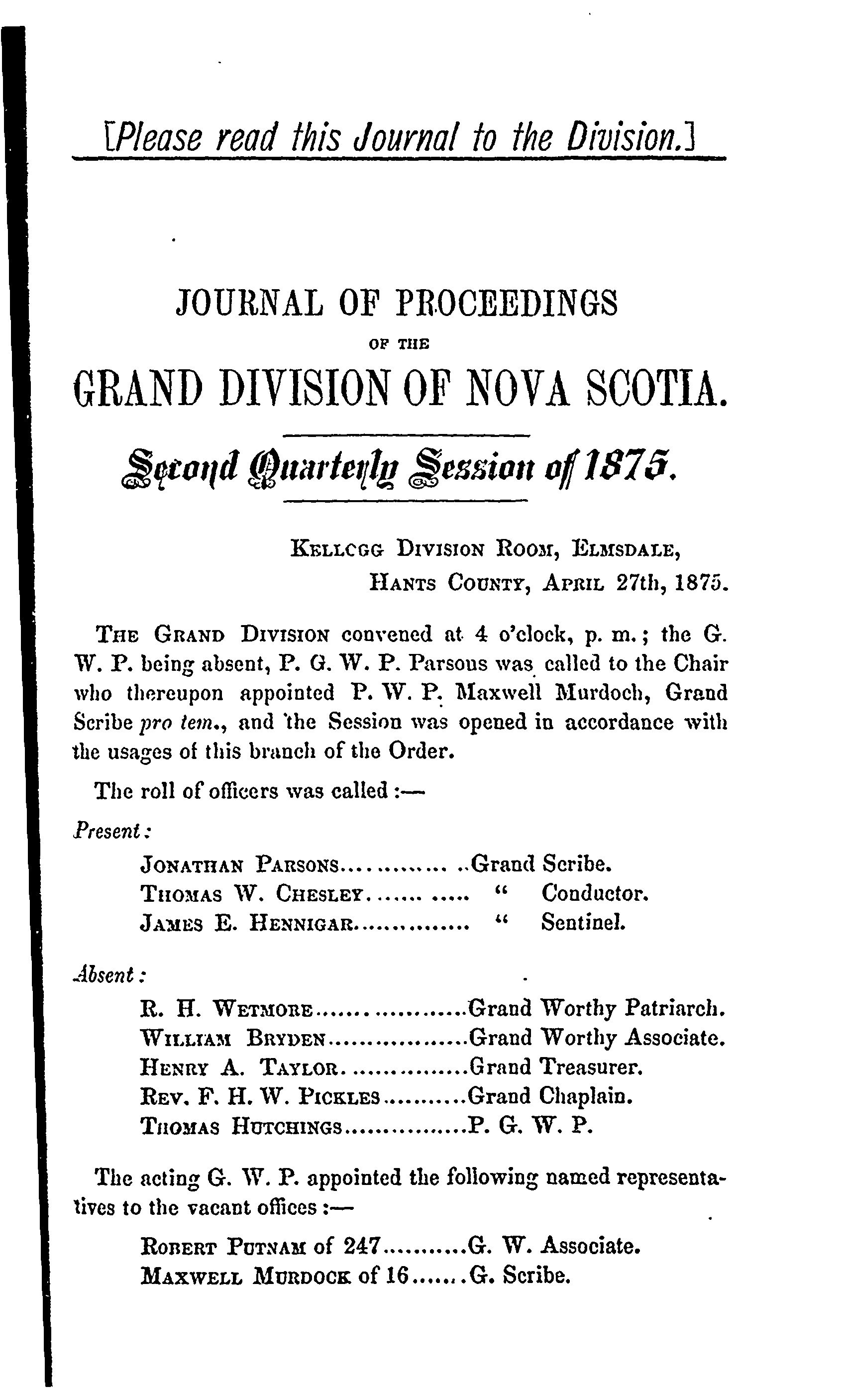 - Journal of proceedings of the Grand Division, S. of T. of Nova Scotia [Vol. 8, no. 10 (Apr. 1875)]