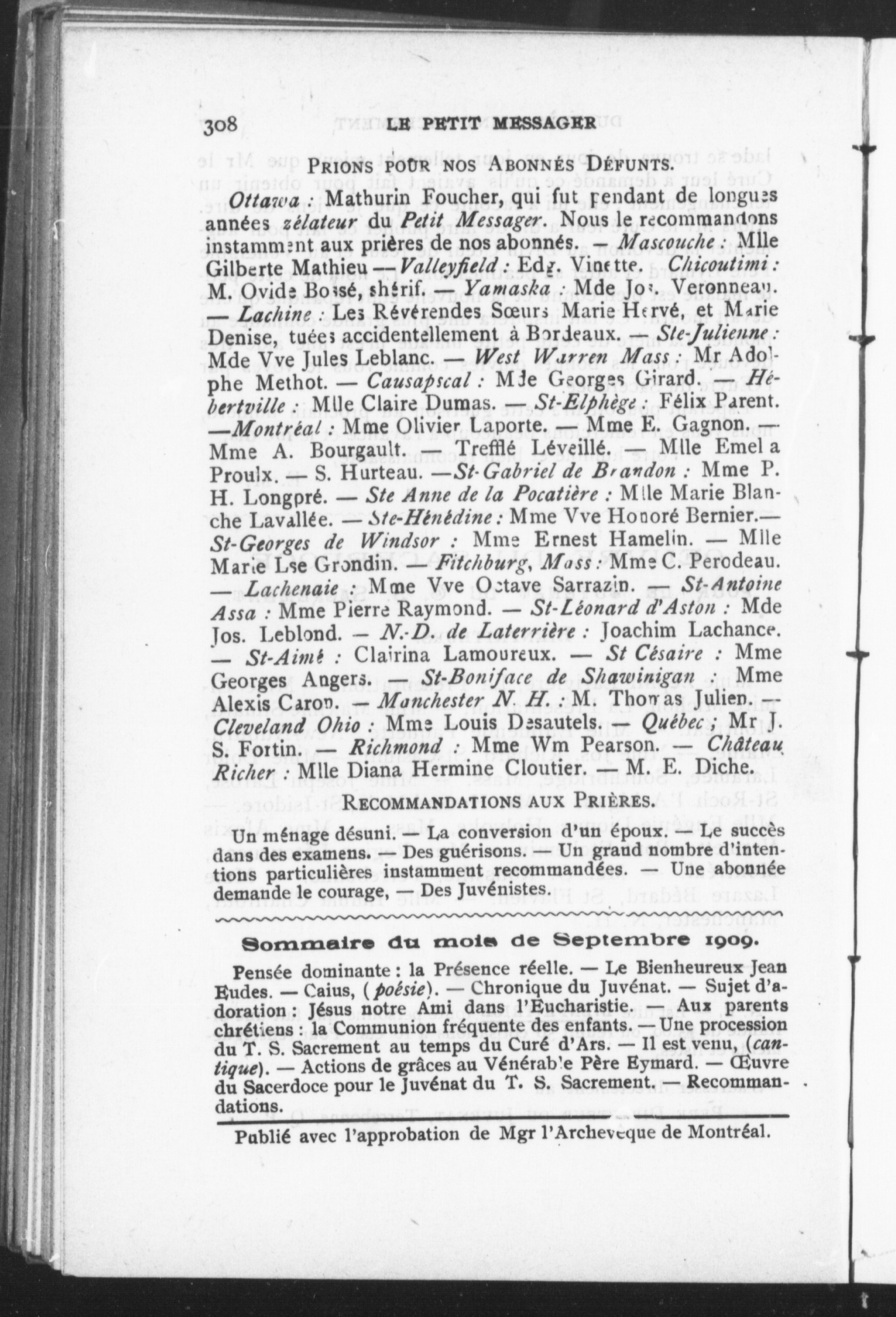 Le petit messager du T-S Sacrement : 12e année, no 9 (sept. 1909)