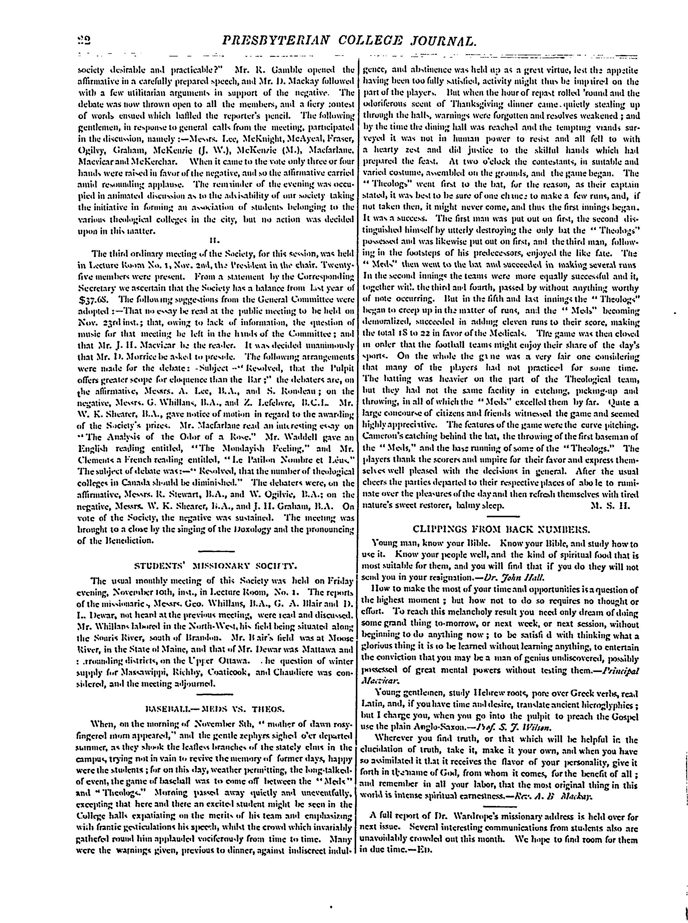 Presbyterian College journal : Vol. 4, no. 2 (Nov. 20, 1883)
