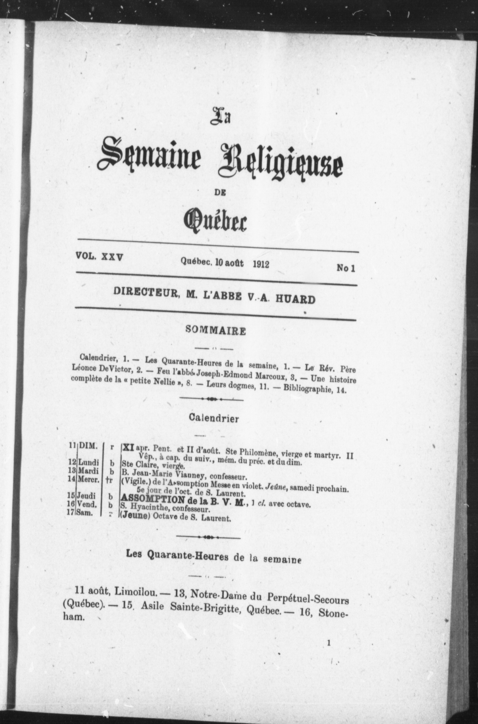 La semaine religieuse de Québec : Vol. 25, no 1 (10 août 1912)