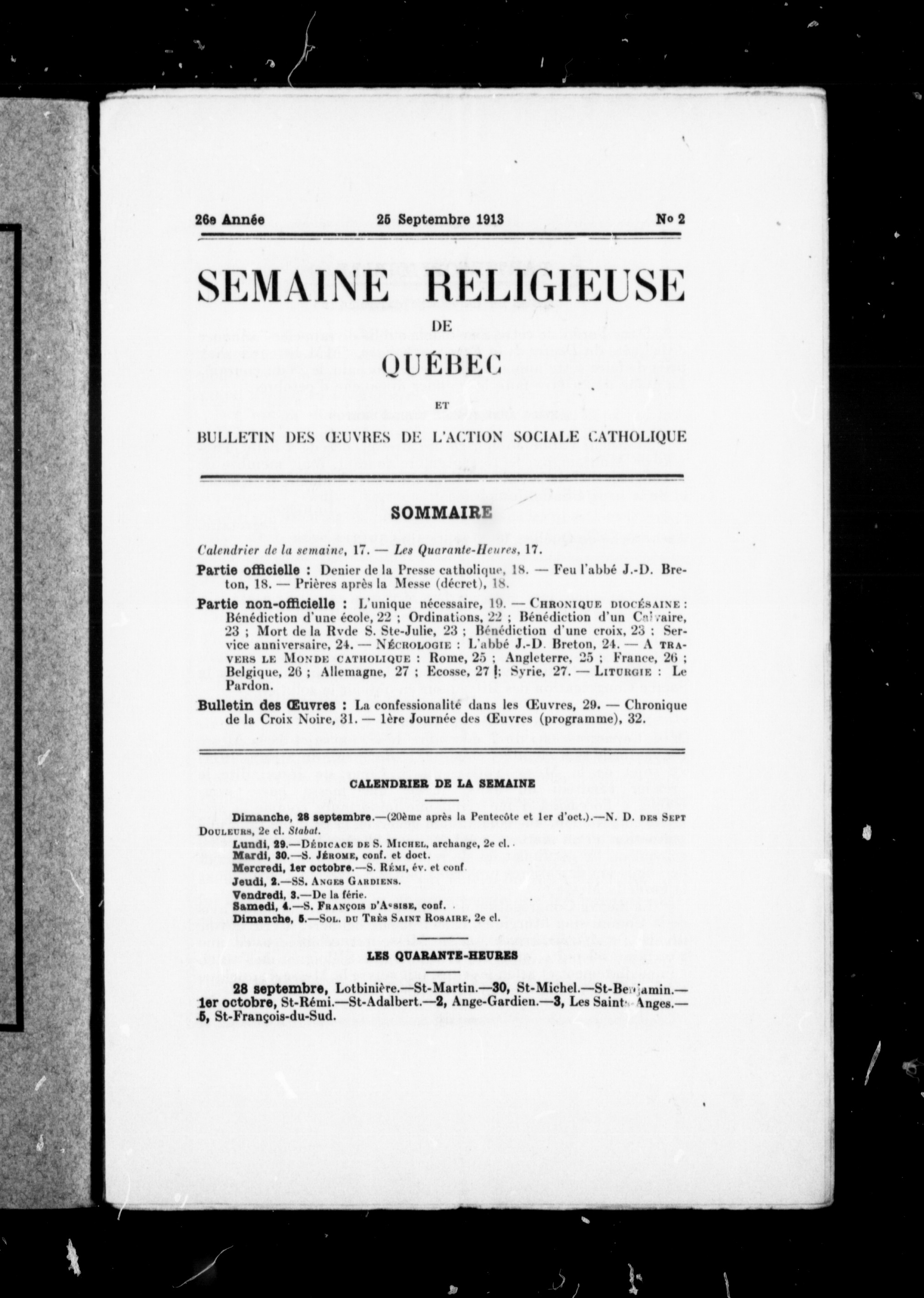 La semaine religieuse de Québec : 26e année, no 2 (25 sept. 1913)
