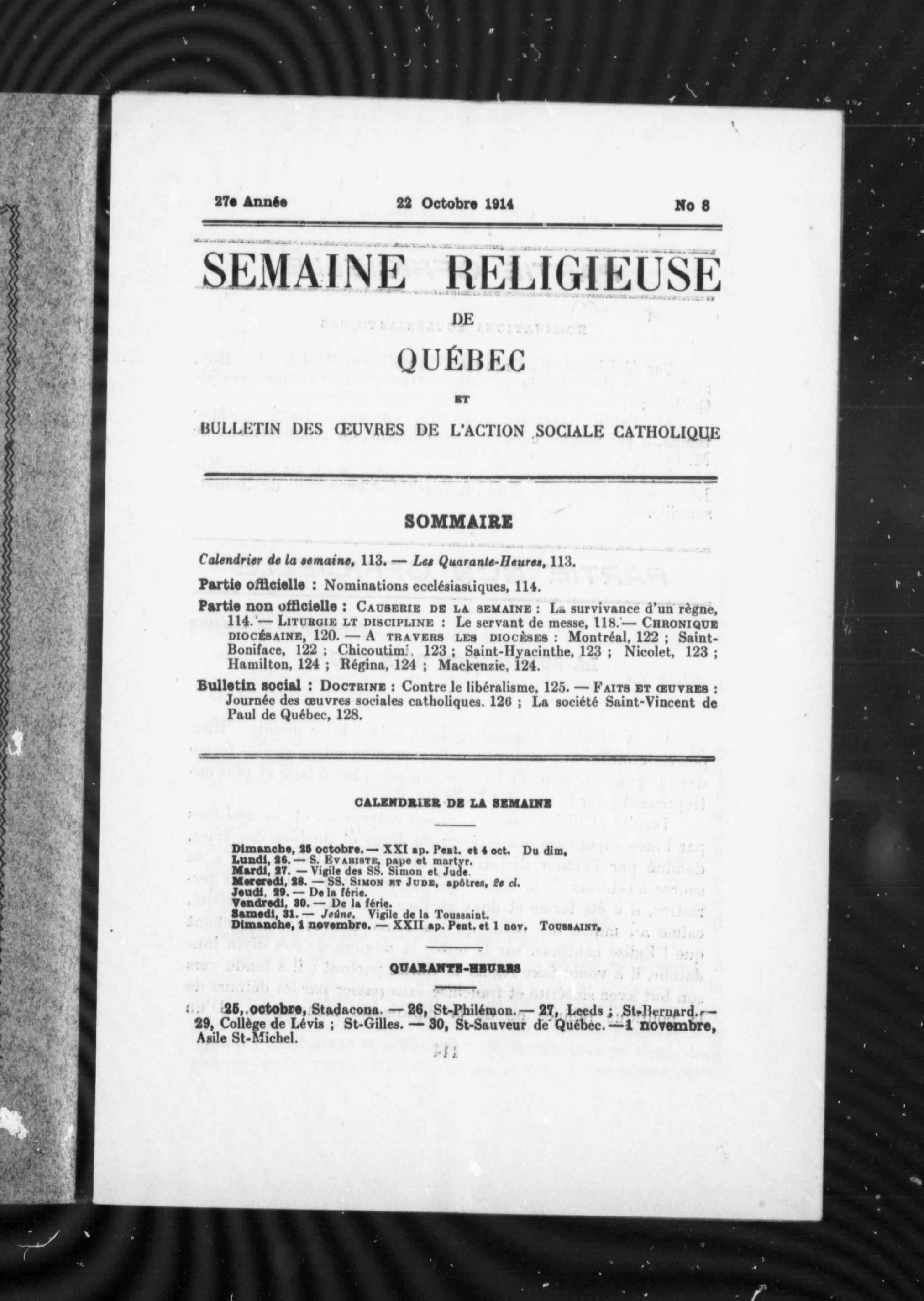 La semaine religieuse de Québec : 27e année, no 8 (22 oct. 1914)