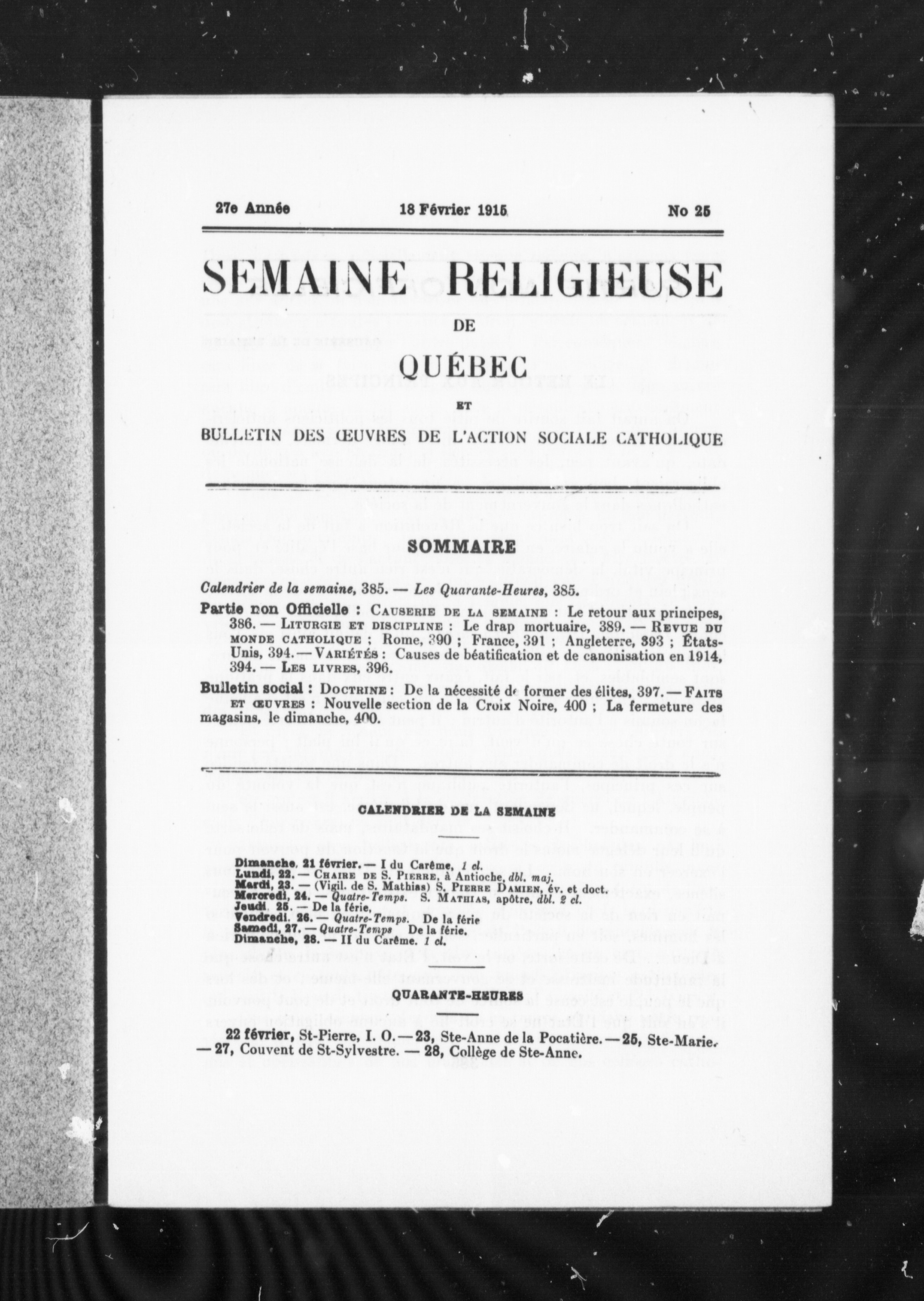La semaine religieuse de Québec : 27e année, no 25 (18 févr. 1915)