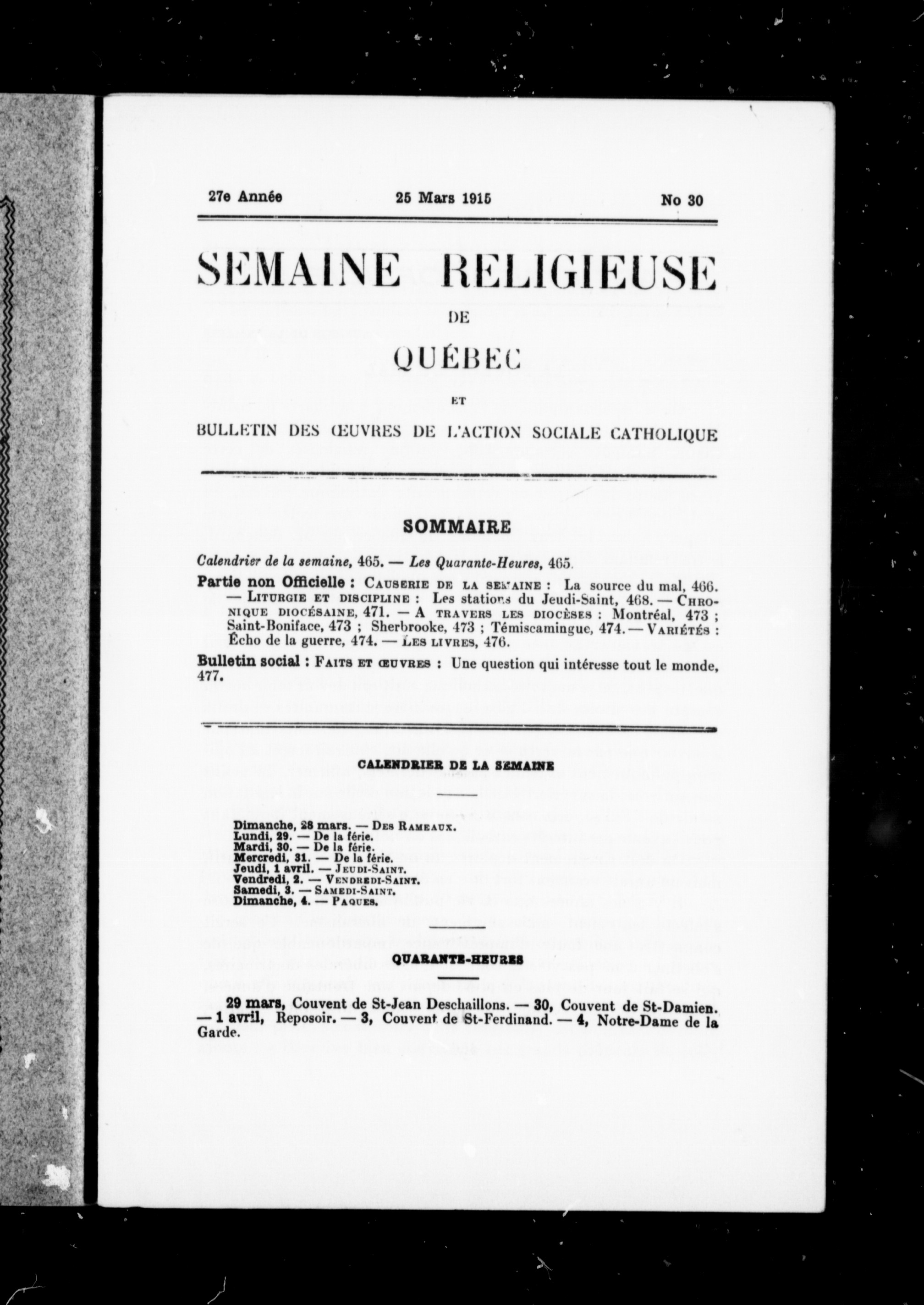 La semaine religieuse de Québec : 27e année, no 30 (25 mars 1915)
