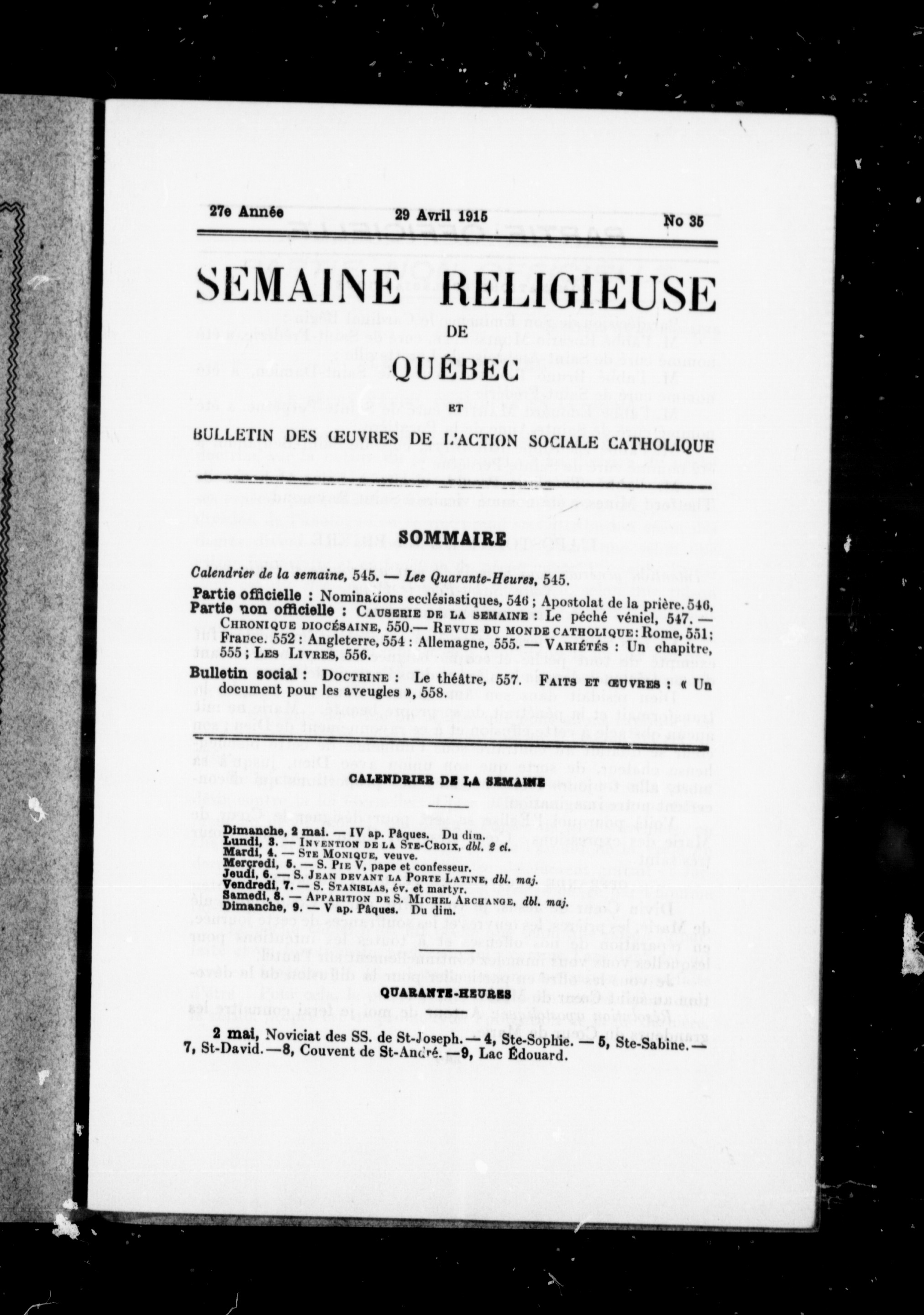 La semaine religieuse de Québec : 27e année, no 35 (29 avril 1915)