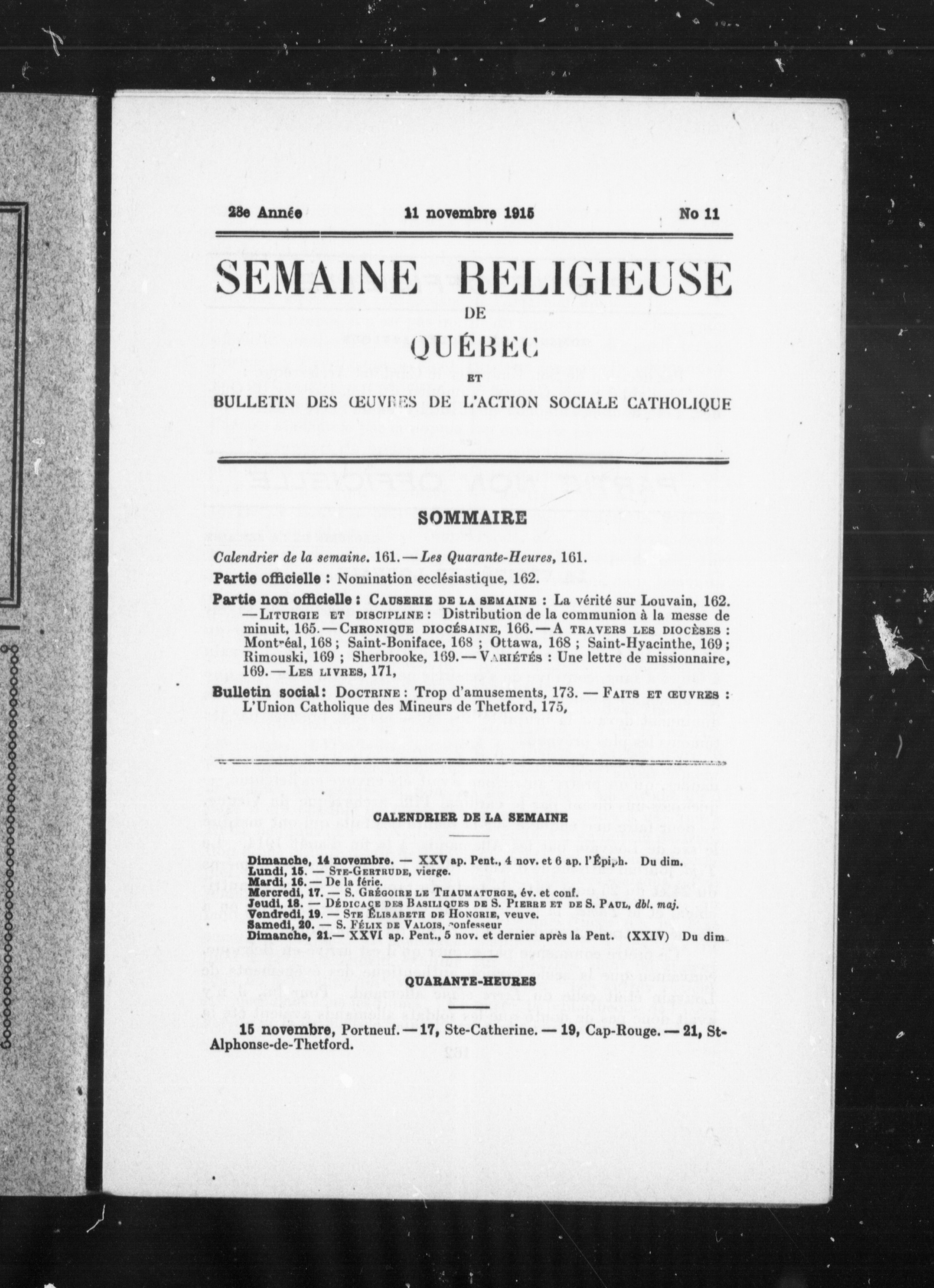 La semaine religieuse de Québec : 28e année, no 11 (11 nov. 1915)