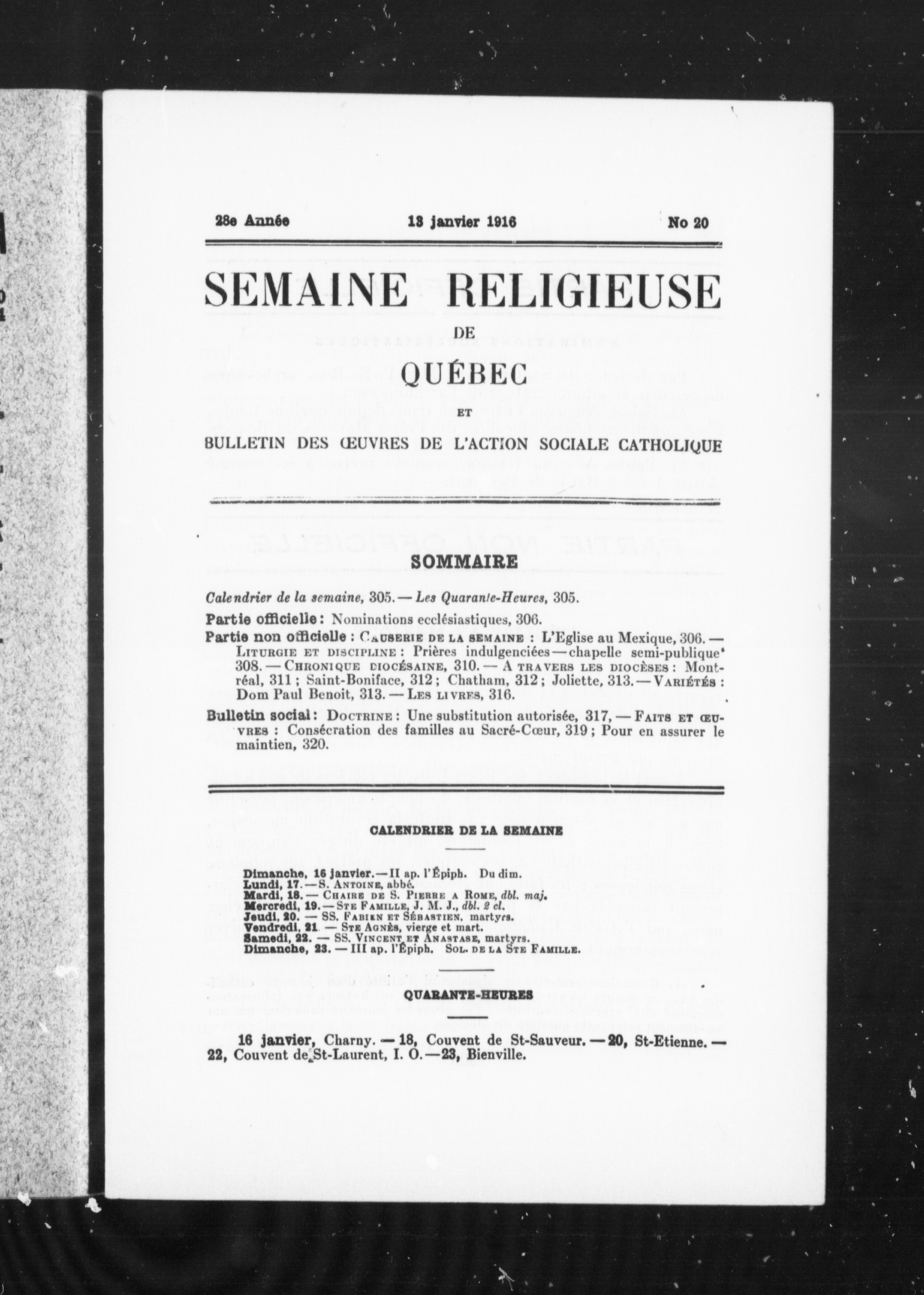 La semaine religieuse de Québec : 28e année, no 20 (13 janv. 1916)