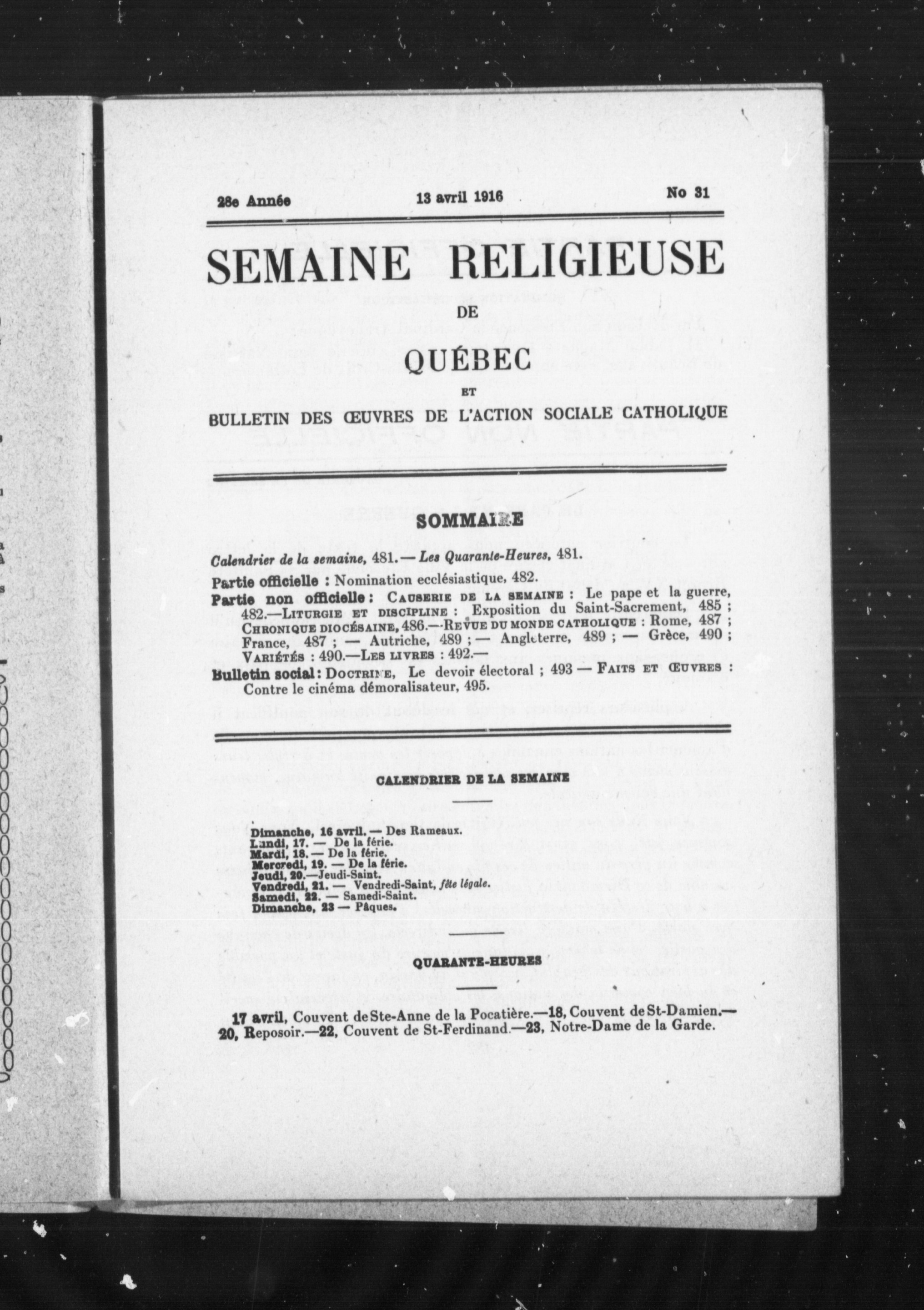La semaine religieuse de Québec : 28e année, no 31 (13 avril 1916)