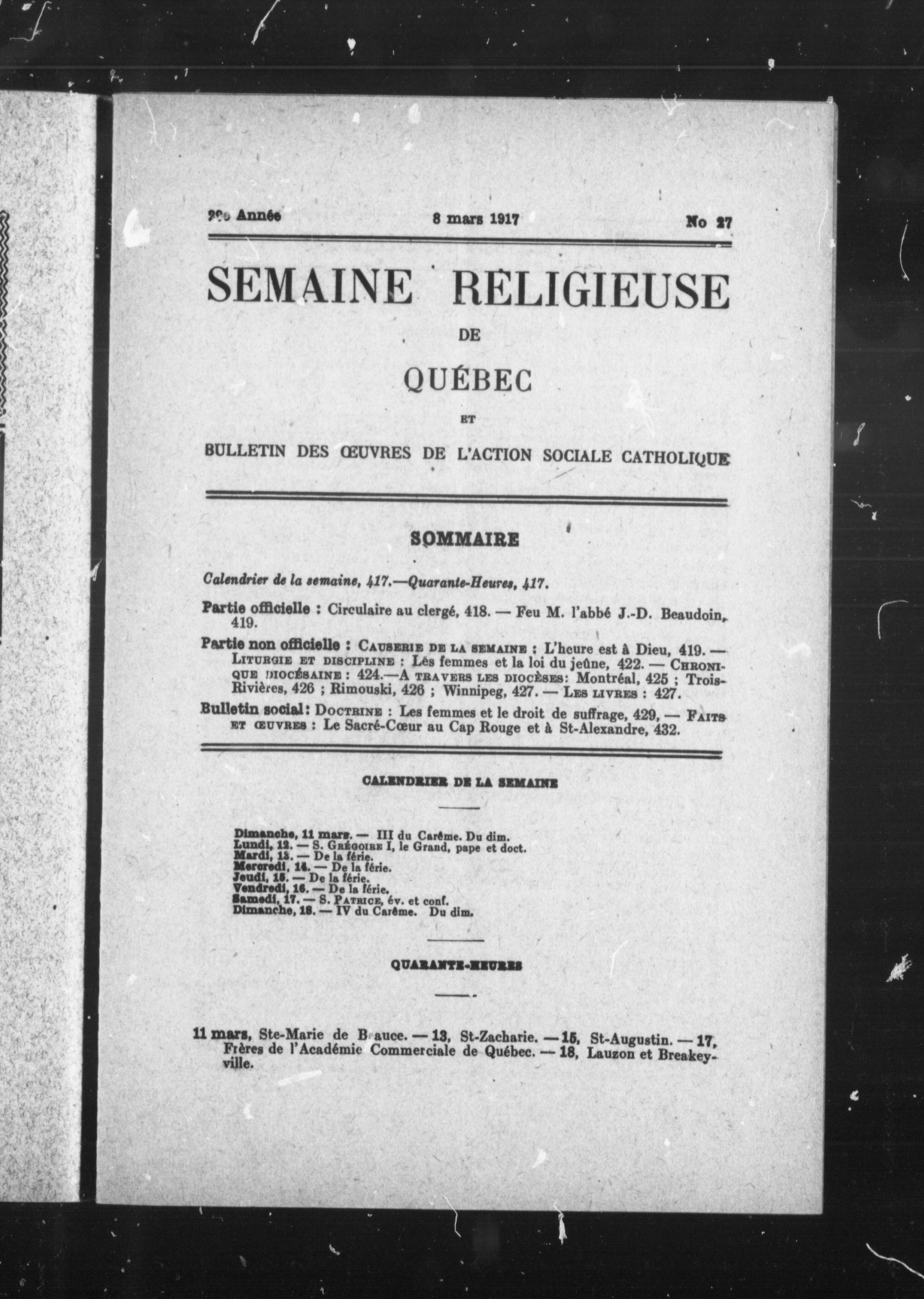 La semaine religieuse de Québec : 29e année, no 27 (8 mars 1917)