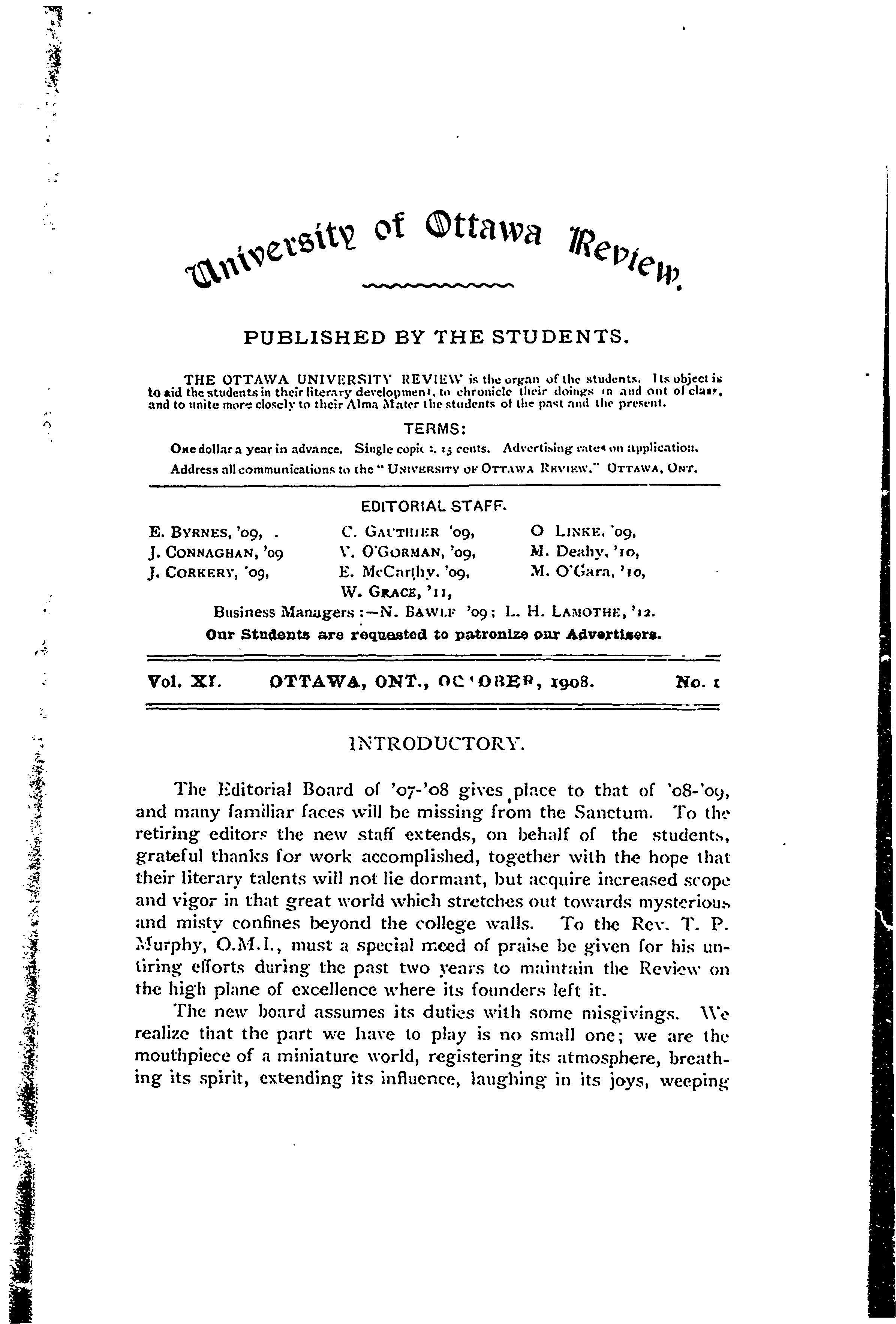 University of Ottawa review : Vol. 11, no. 1 (Oct. 1908)