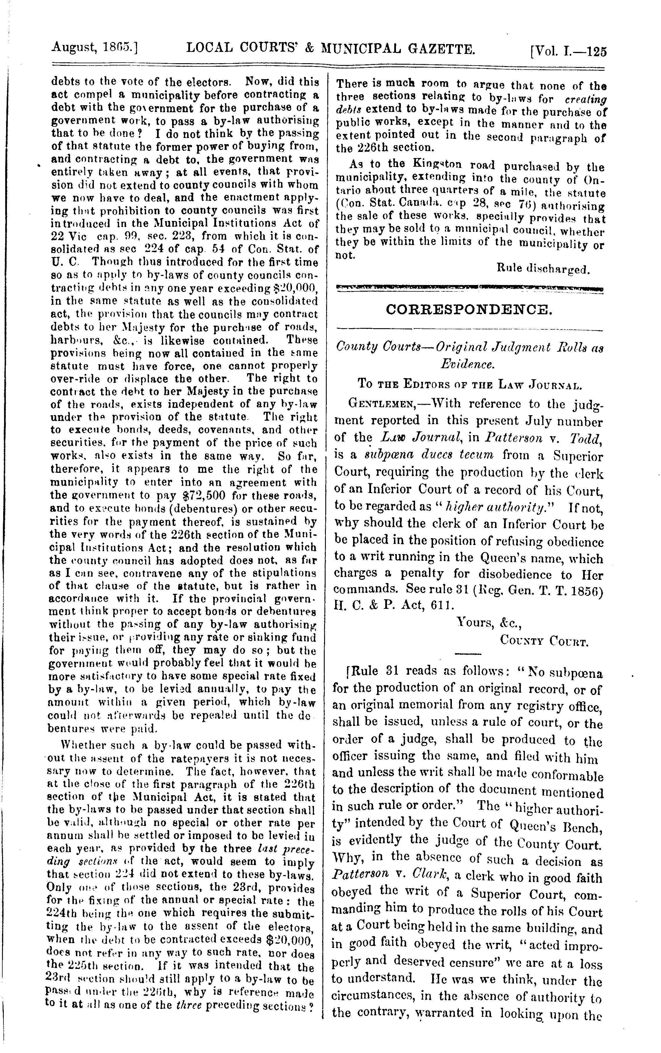 The local courts' and municipal gazette [Vol. 1 (Aug. 1865)]