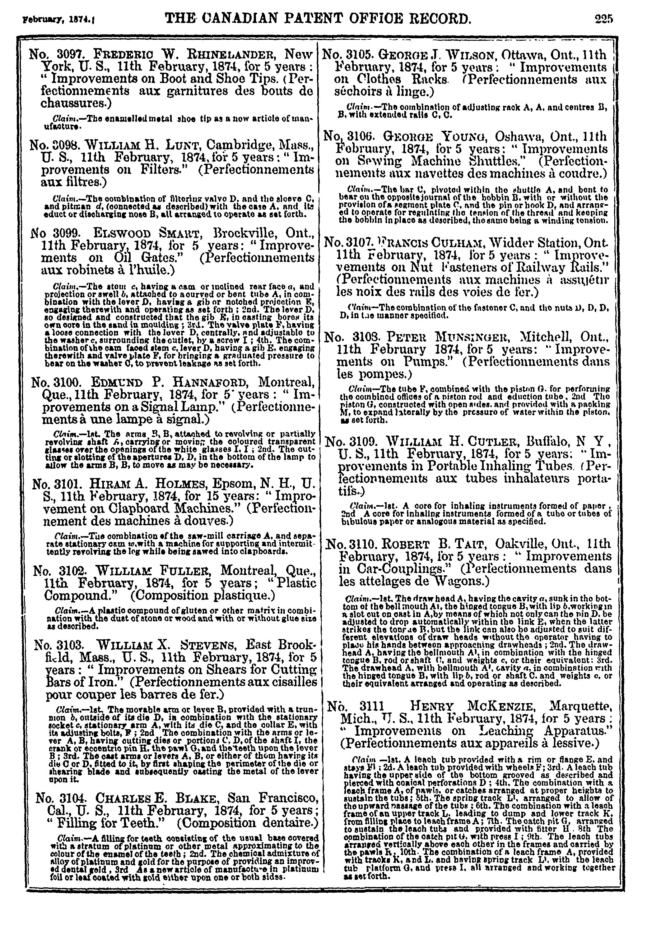 The Canadian Patent Office record [Vol. 1, no. 11 (Feb. 1874)]