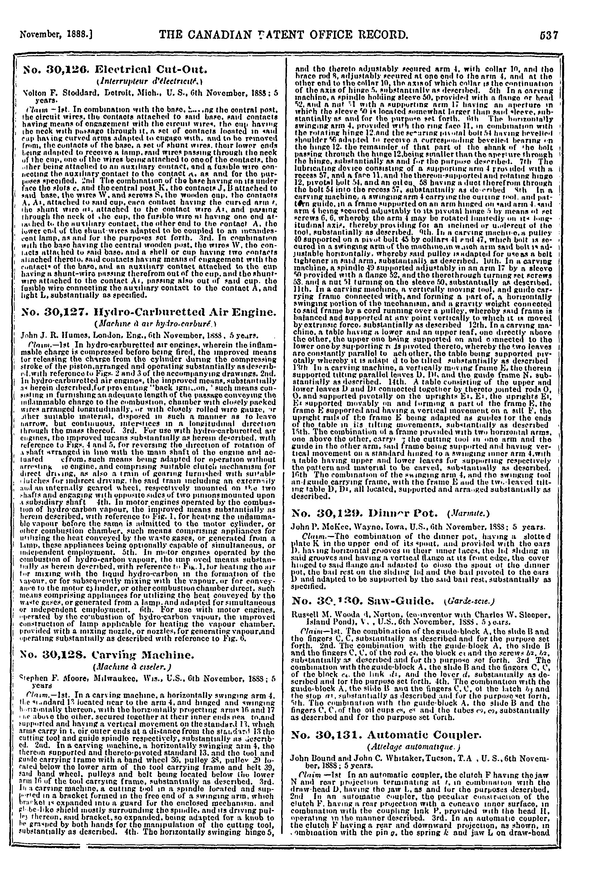 The Canadian Patent Office record [Vol. 16, no. 11 (Nov. 1888)]