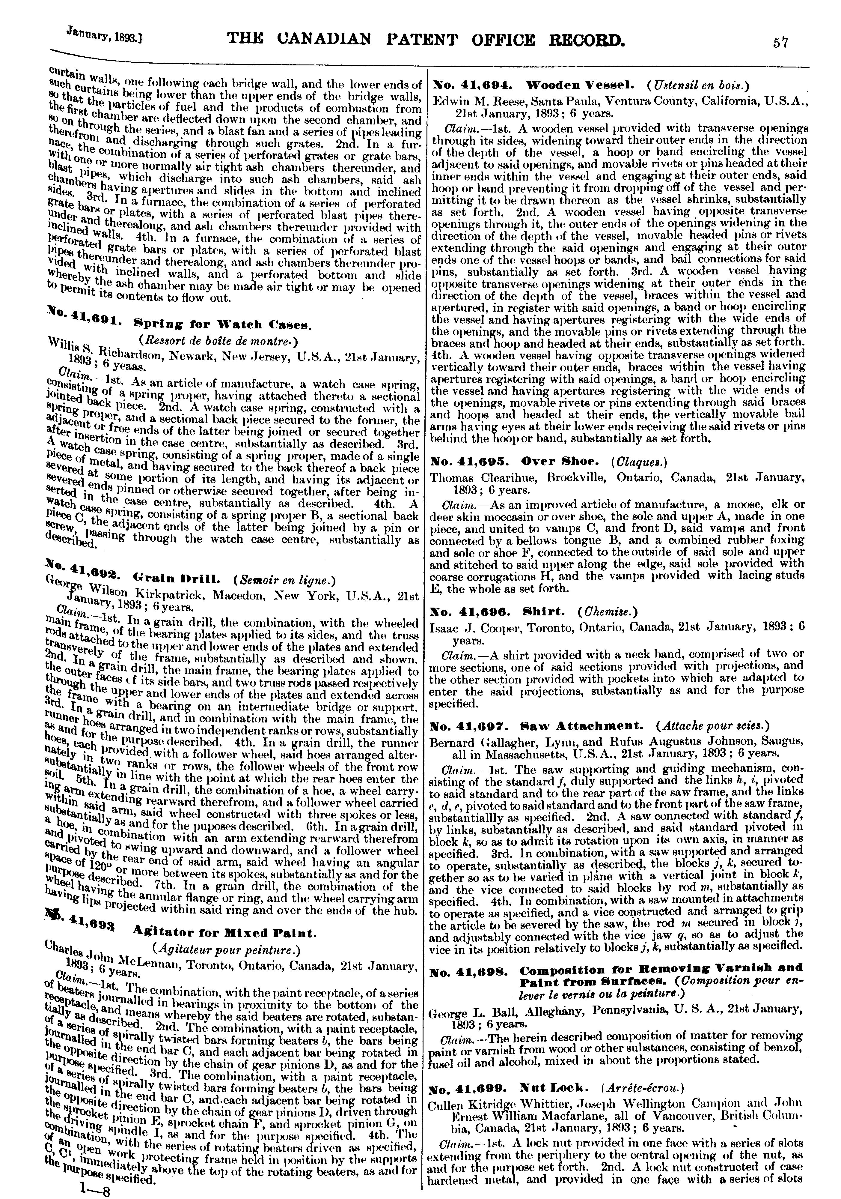 The Canadian Patent Office record [Vol. 21, no. 1 (Jan. 1893)]