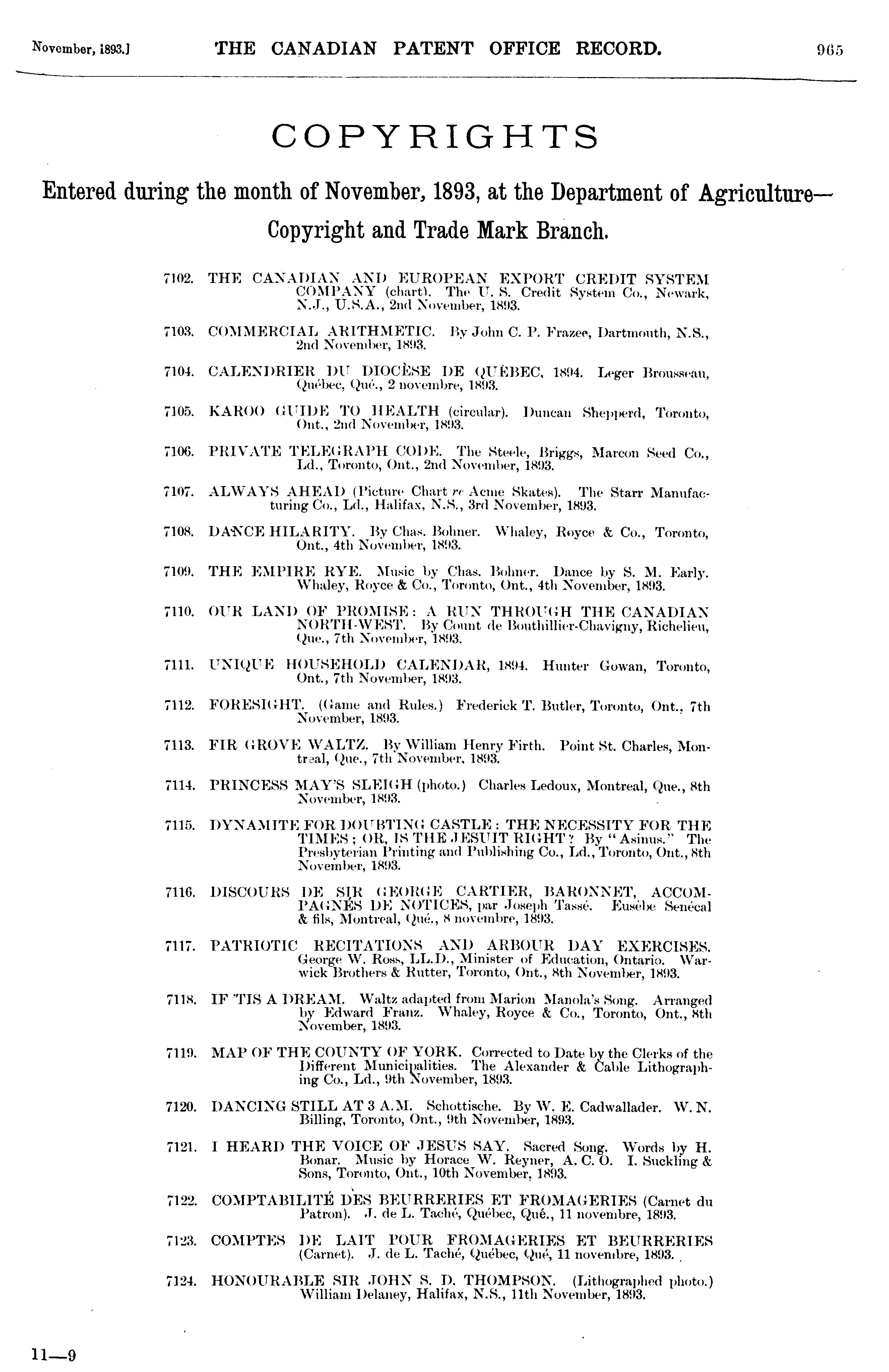 - The Canadian Patent Office record [Vol. 21, no. 11 (Nov. 30, 1893)]