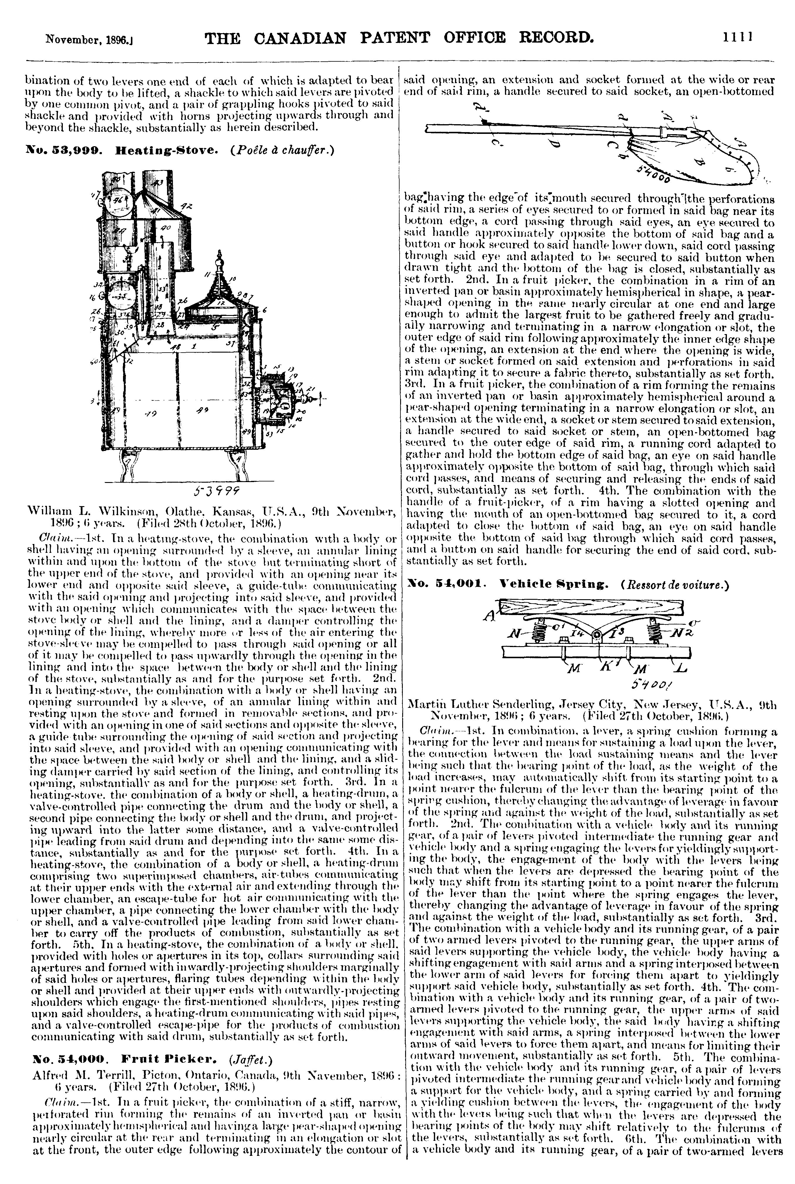 The Canadian Patent Office record : [Vol. 24, no. 11 (Nov. 30, 1896)]