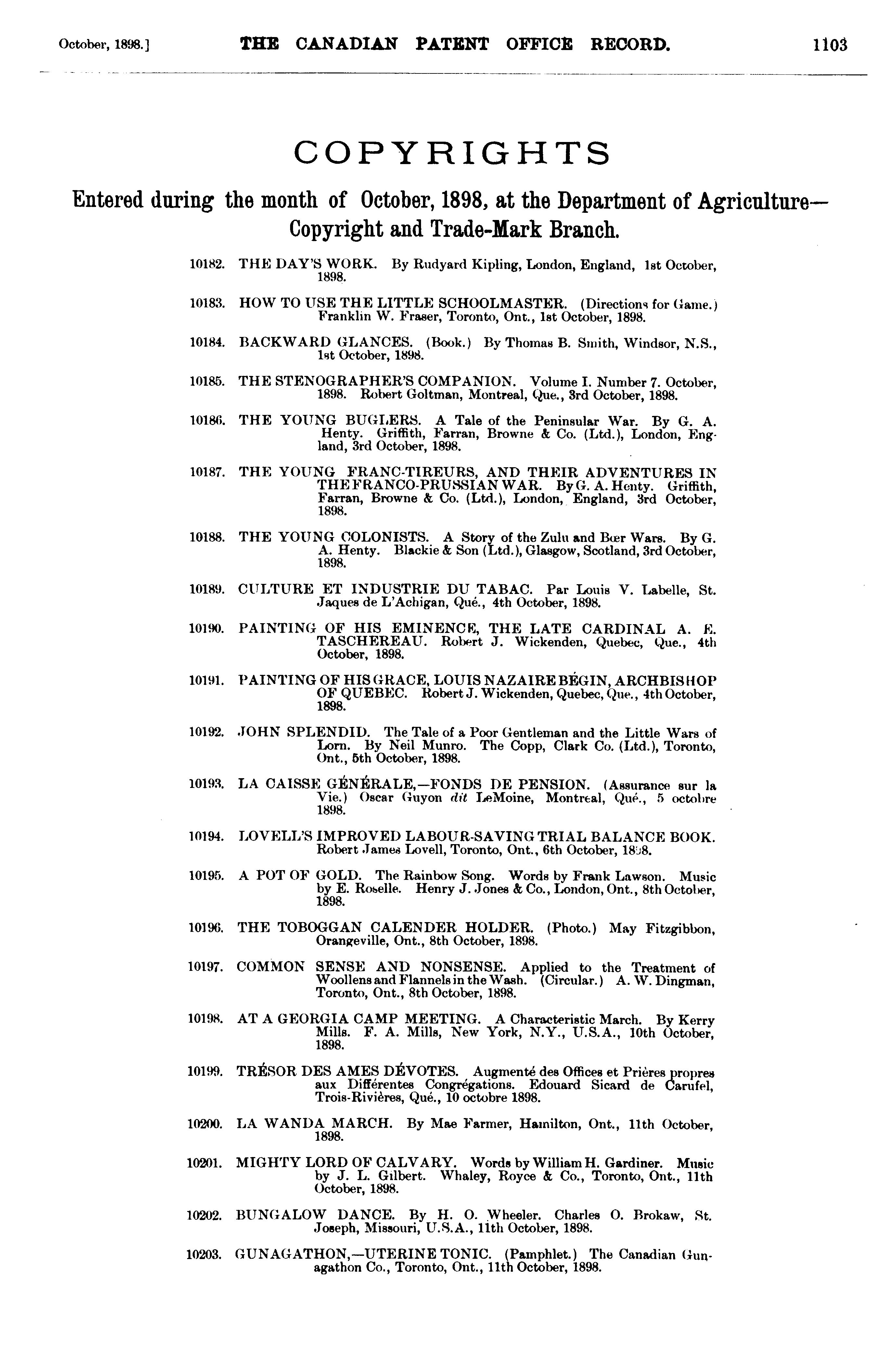 The Canadian Patent Office record : [Vol. 26, no. 10 (Oct. 31, 1898)]