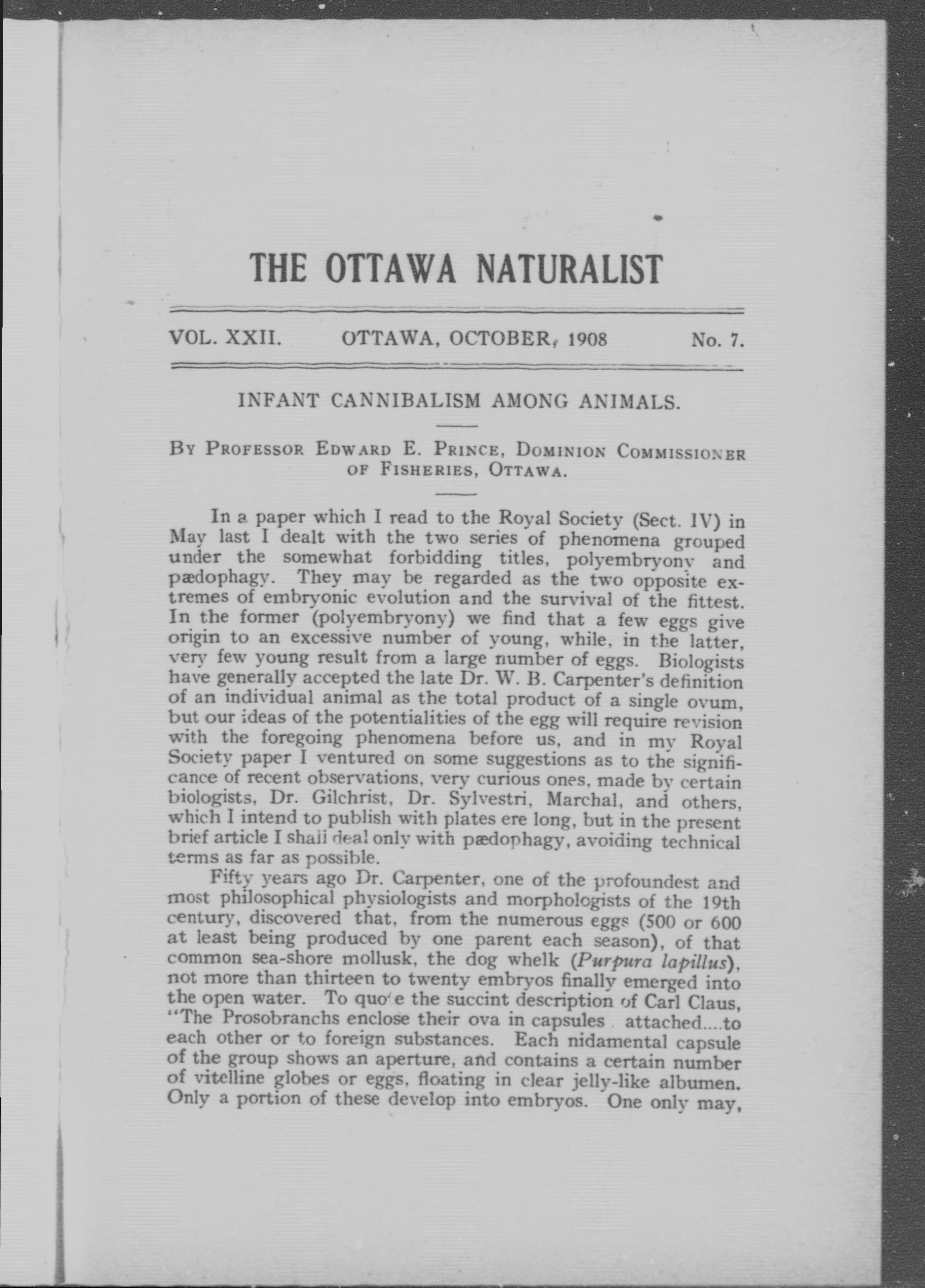 The Ottawa naturalist : Vol. 22, no. 7 (Oct. 1908)