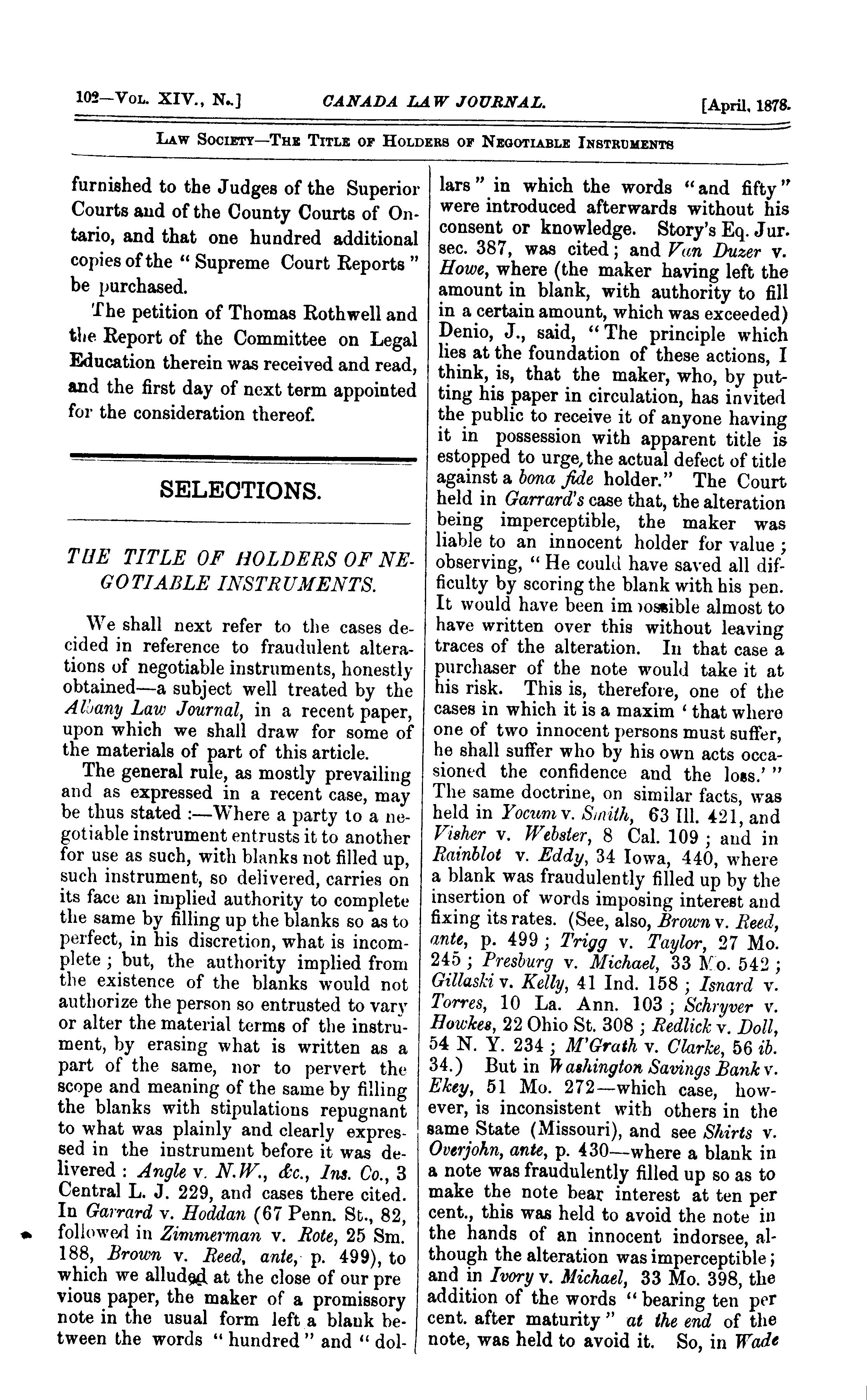 - Canada law journal [New ser. v. 14, [no. 4], pt. 1 (Apr. 1878)]
