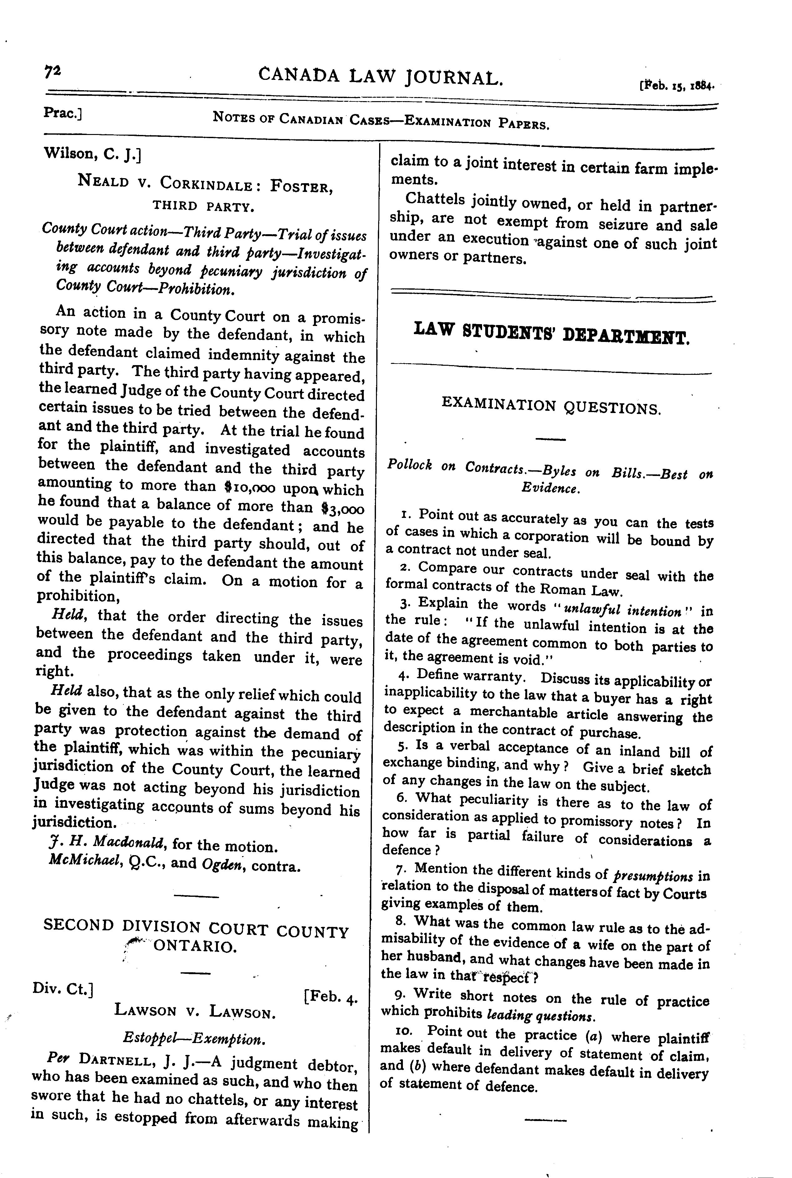 - Canada law journal [Vol. 20, no. 4 (Feb. 15, 1884)]