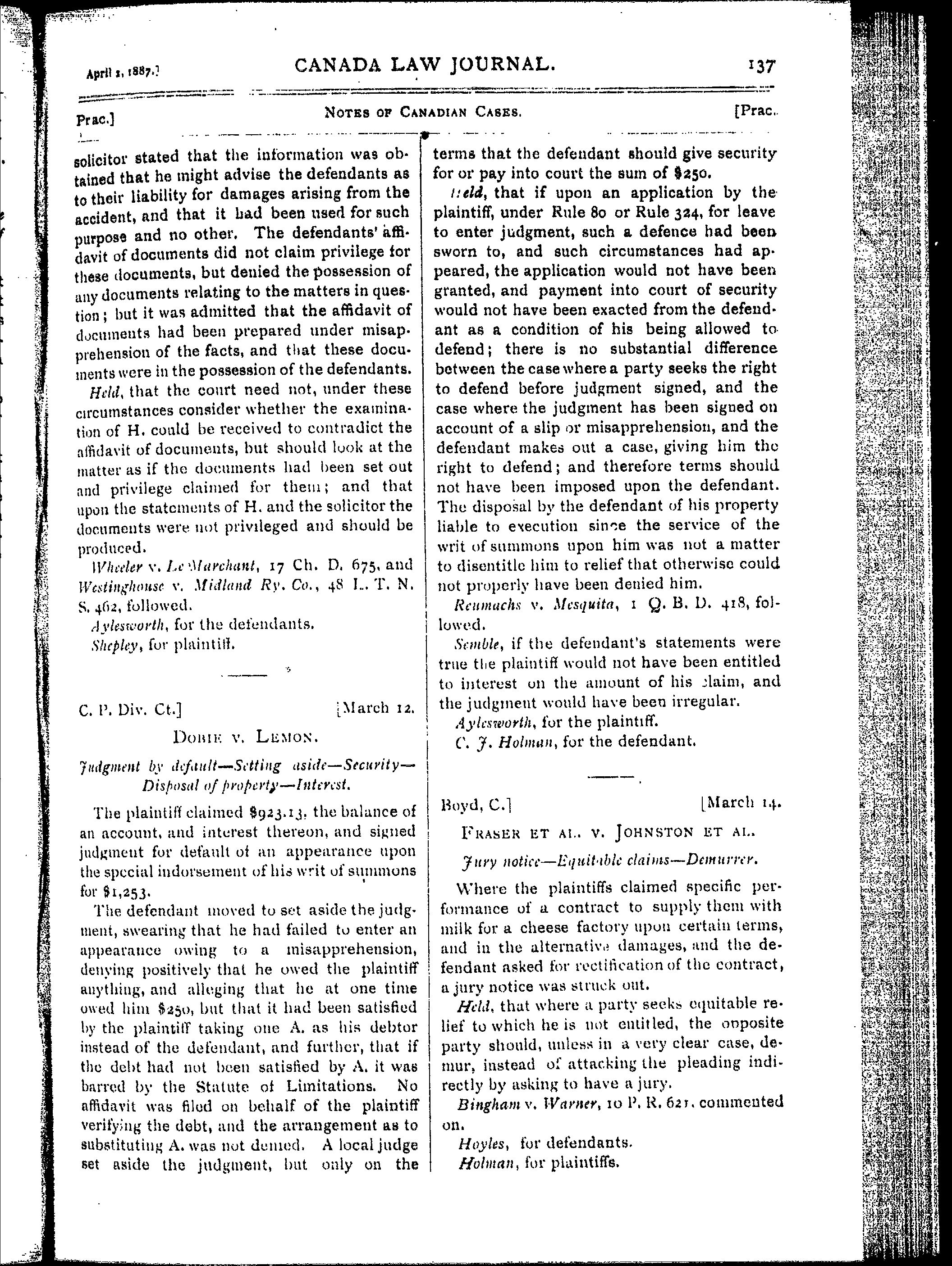 Toronto : [Canada Law Journal Office, 1887]