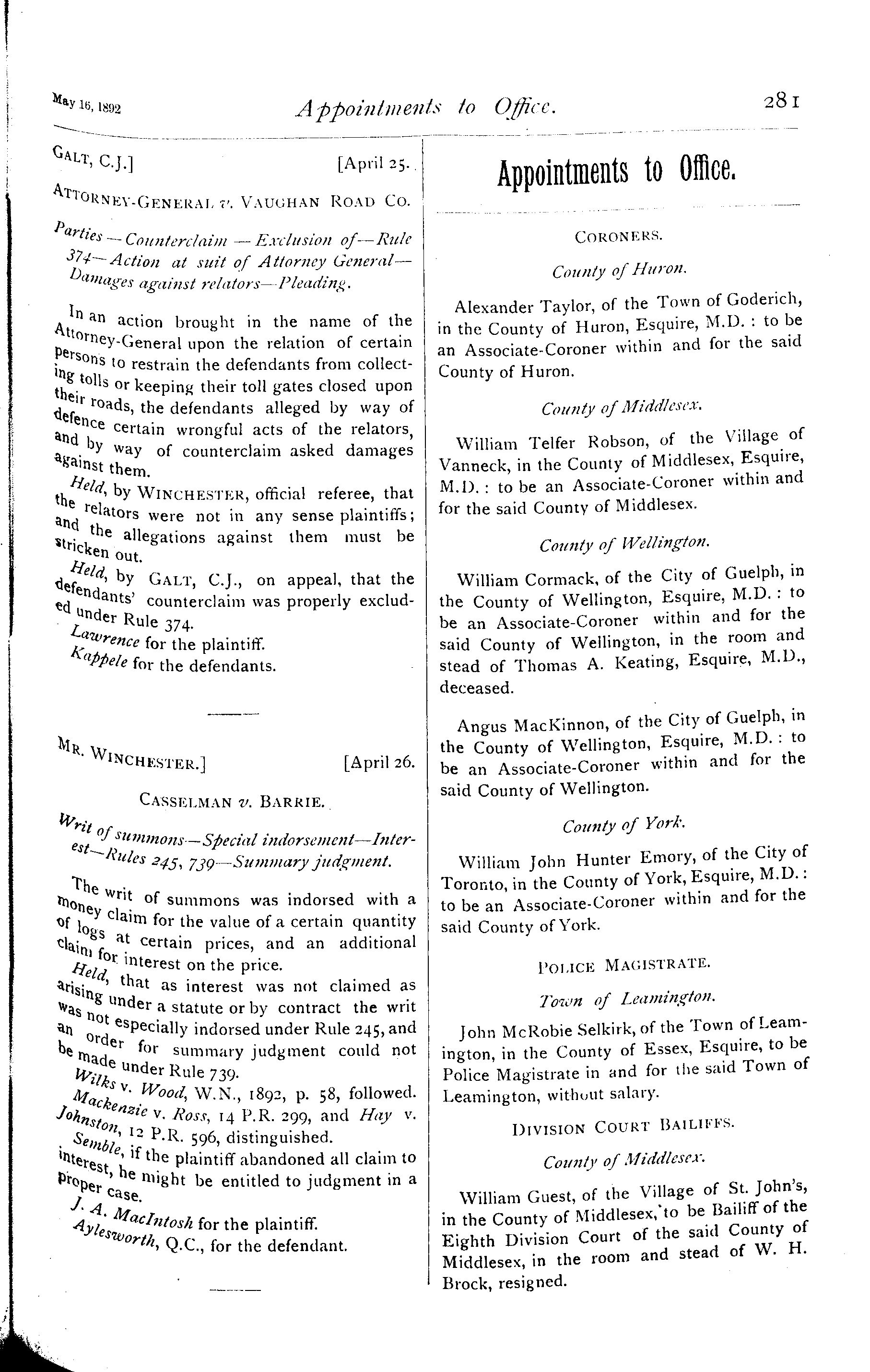 - The Canada law journal [Vol. 28, no. 9 (May 16, 1892)]