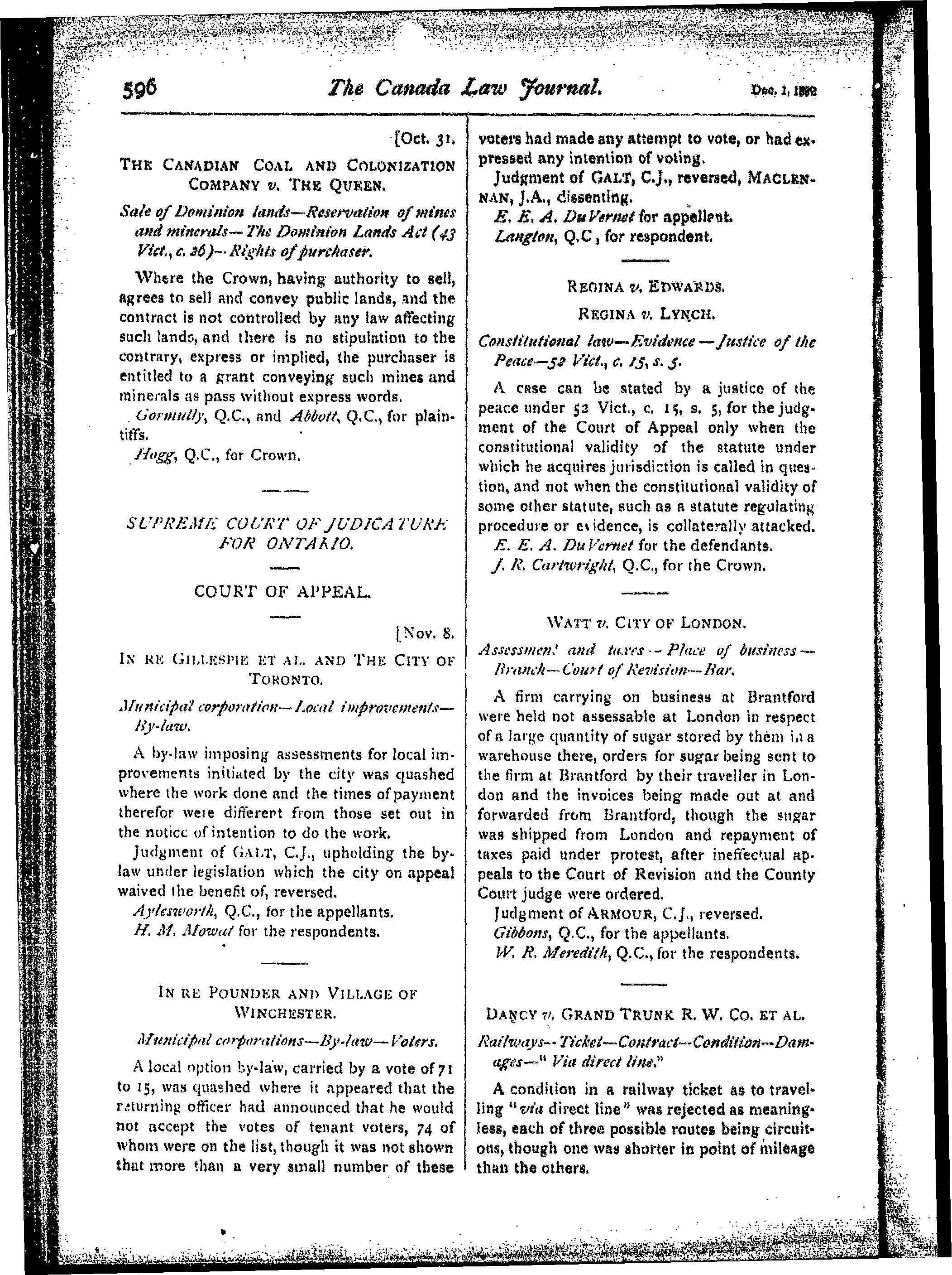 The Canada law journal [Vol. 28, no. 19 (Dec. 1, 1892)]