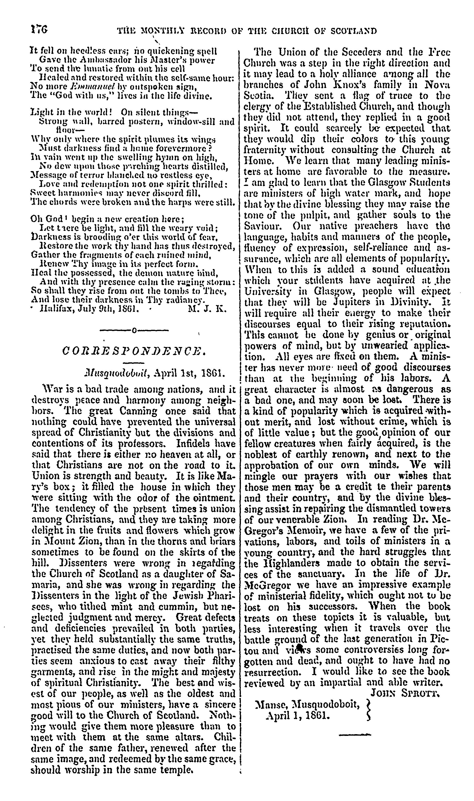 - The monthly record of the Church of Scotland in Nova Scotia and the adjoining provinces [Vol. 7, no. 12 (Aug. 1861)]