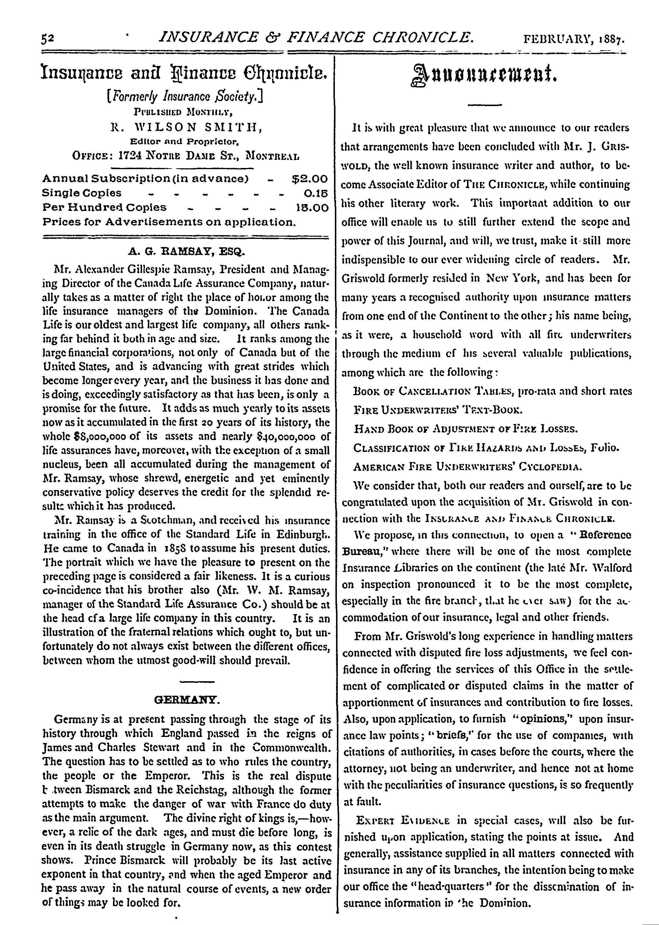 Insurance and finance chronicle : [Vol. 7, no. 2 (Feb. 1887)]
