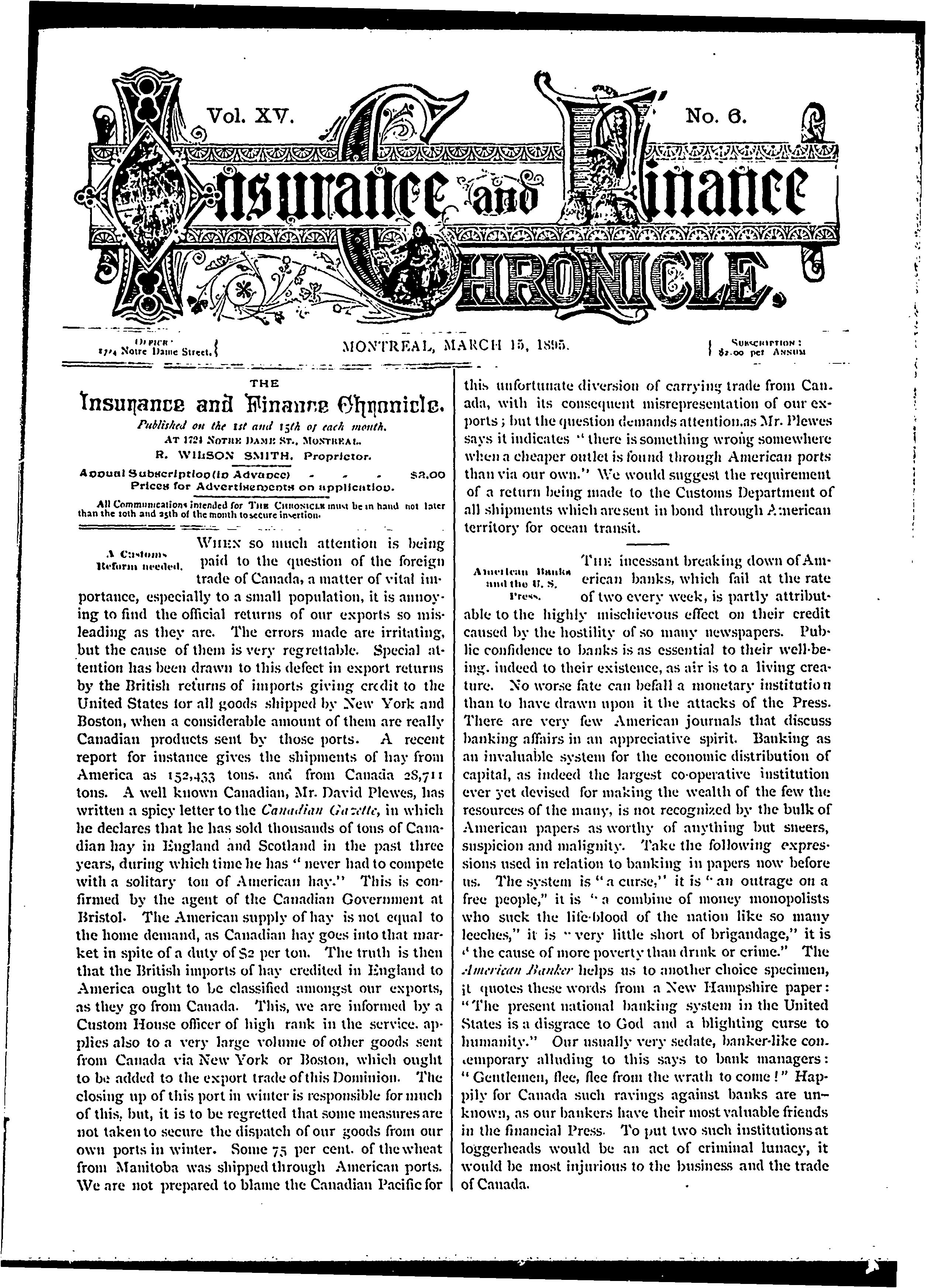 Insurance and finance chronicle : [Vol. 15, no. 6 (Mar. 15, 1895)]
