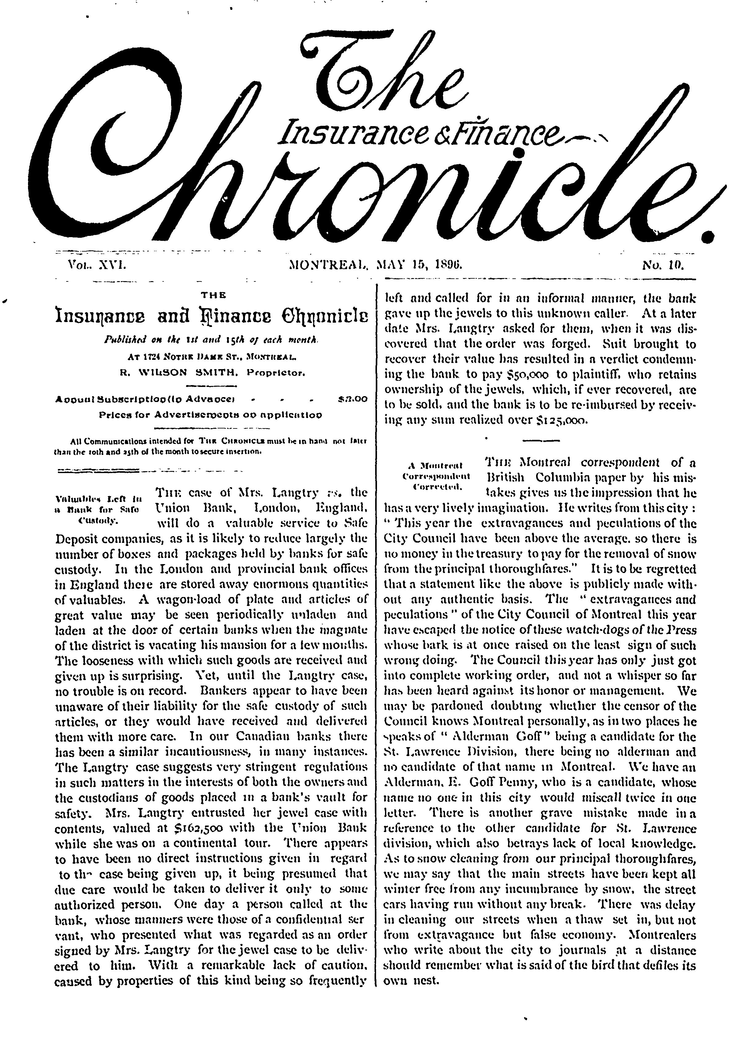 Insurance and finance chronicle : [Vol. 16, no. 10 (May 15, 1896)]