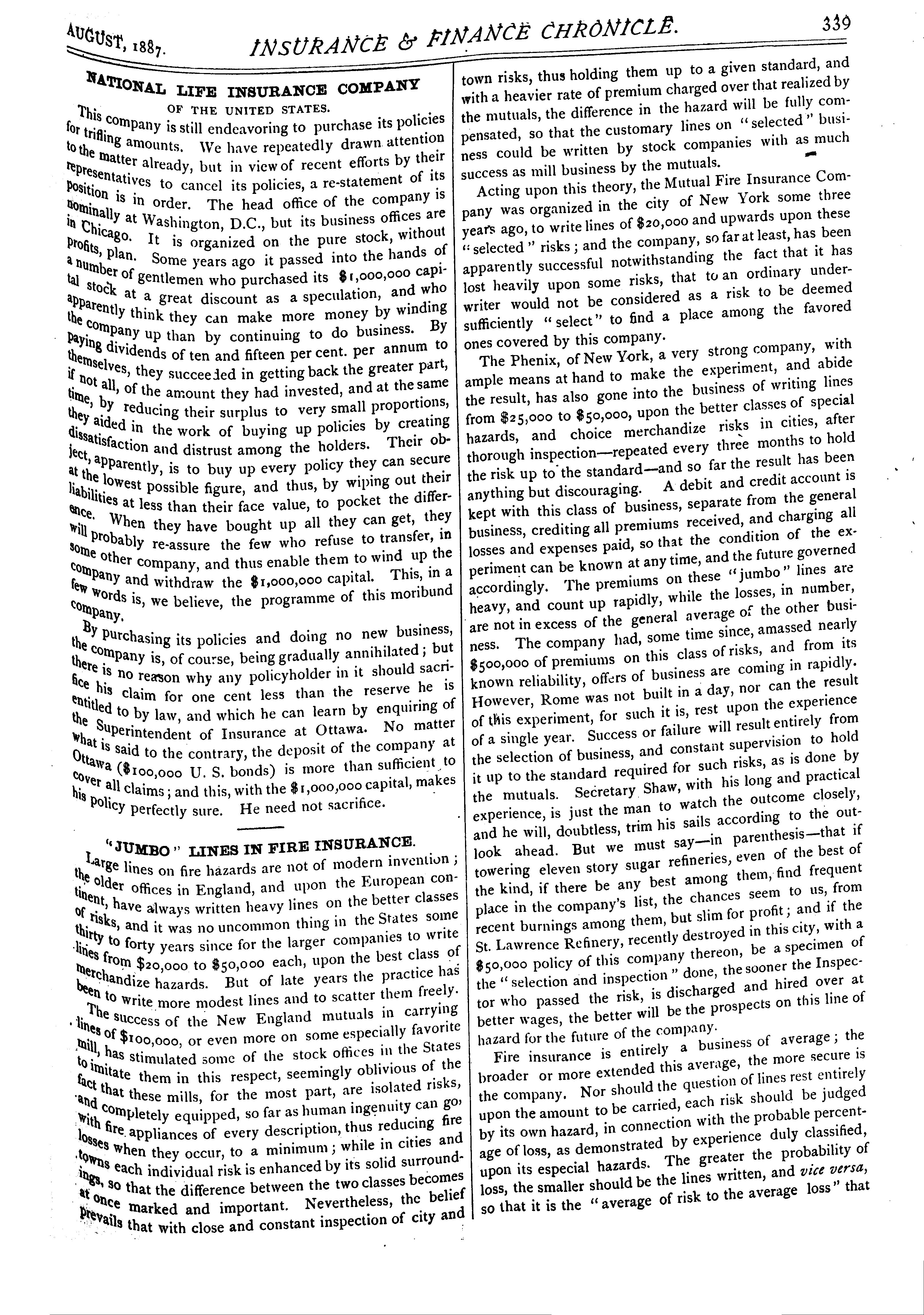 Insurance and finance chronicle : [Vol. 7, no. 8 (Aug. 1887)]