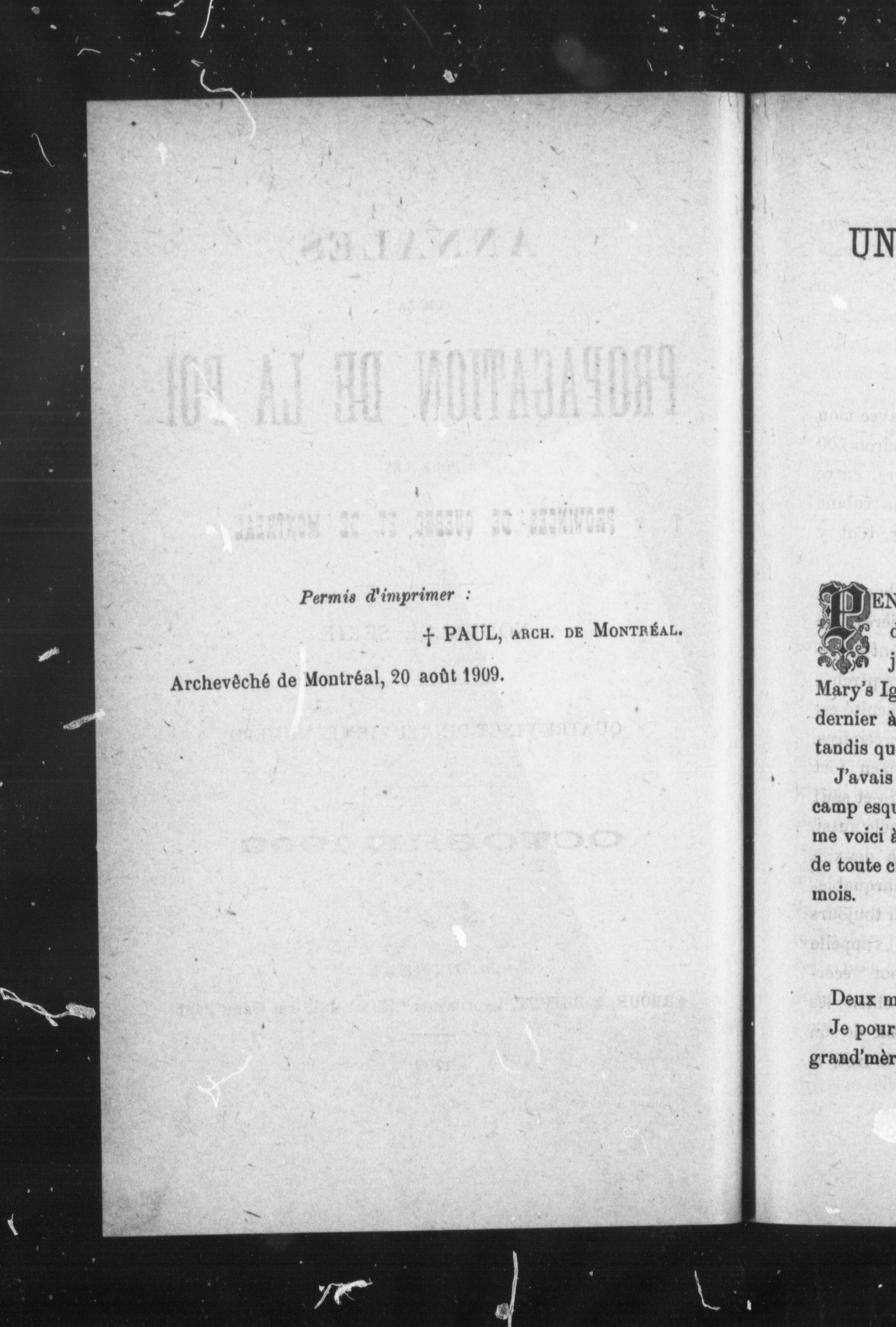 Annales de la propagation de la foi pour les provinces de Québec et de Montréal : Nouv. sér., 99e no (oct. 1909)