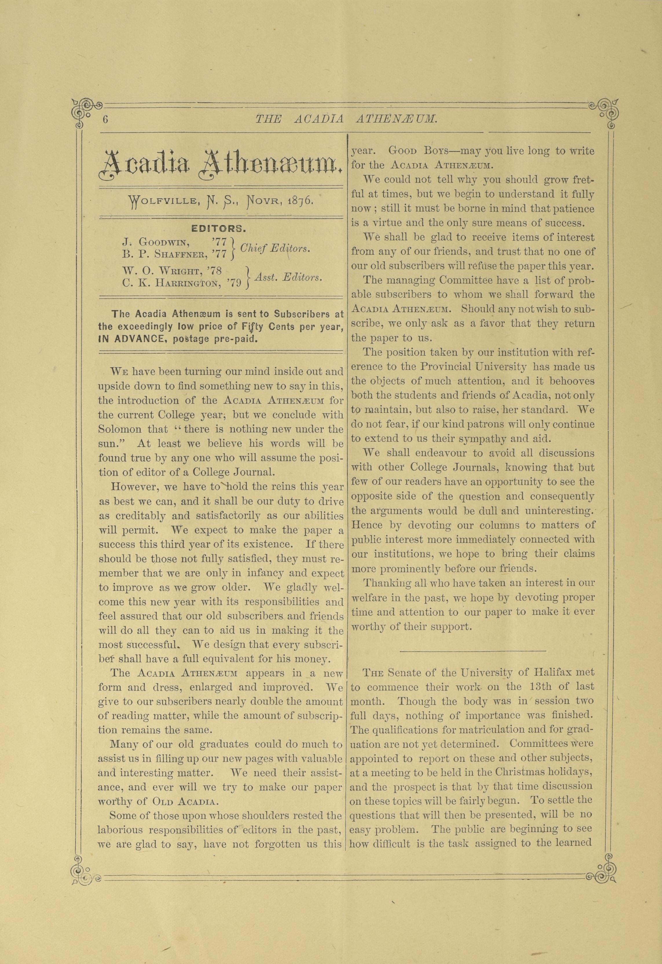 Acadia athenaeum : The Acadia athenaeum : [Vol. 3, no. 1] (Nov. 1876)