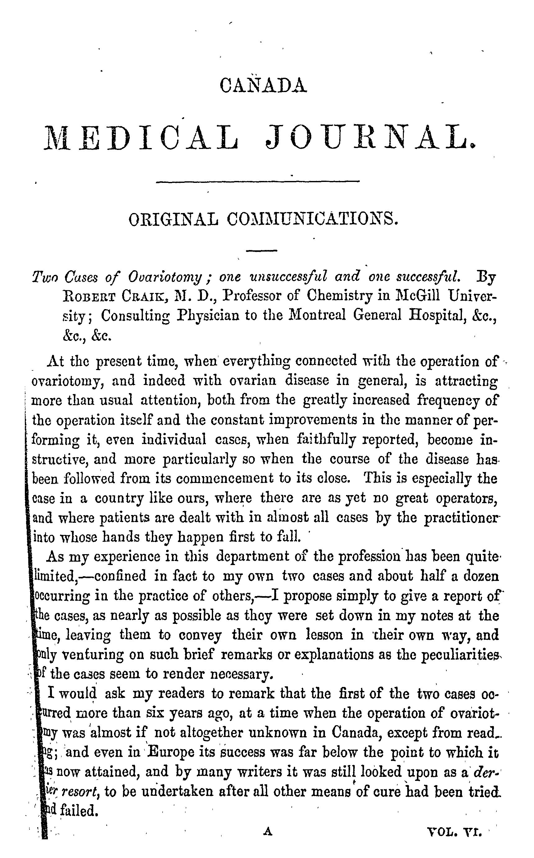 Canada medical journal and monthly record of medical and surgical science. : Canada medical journal and monthly record of medical and surgical science : Vol. 6, [no. 1 (July 1869)]