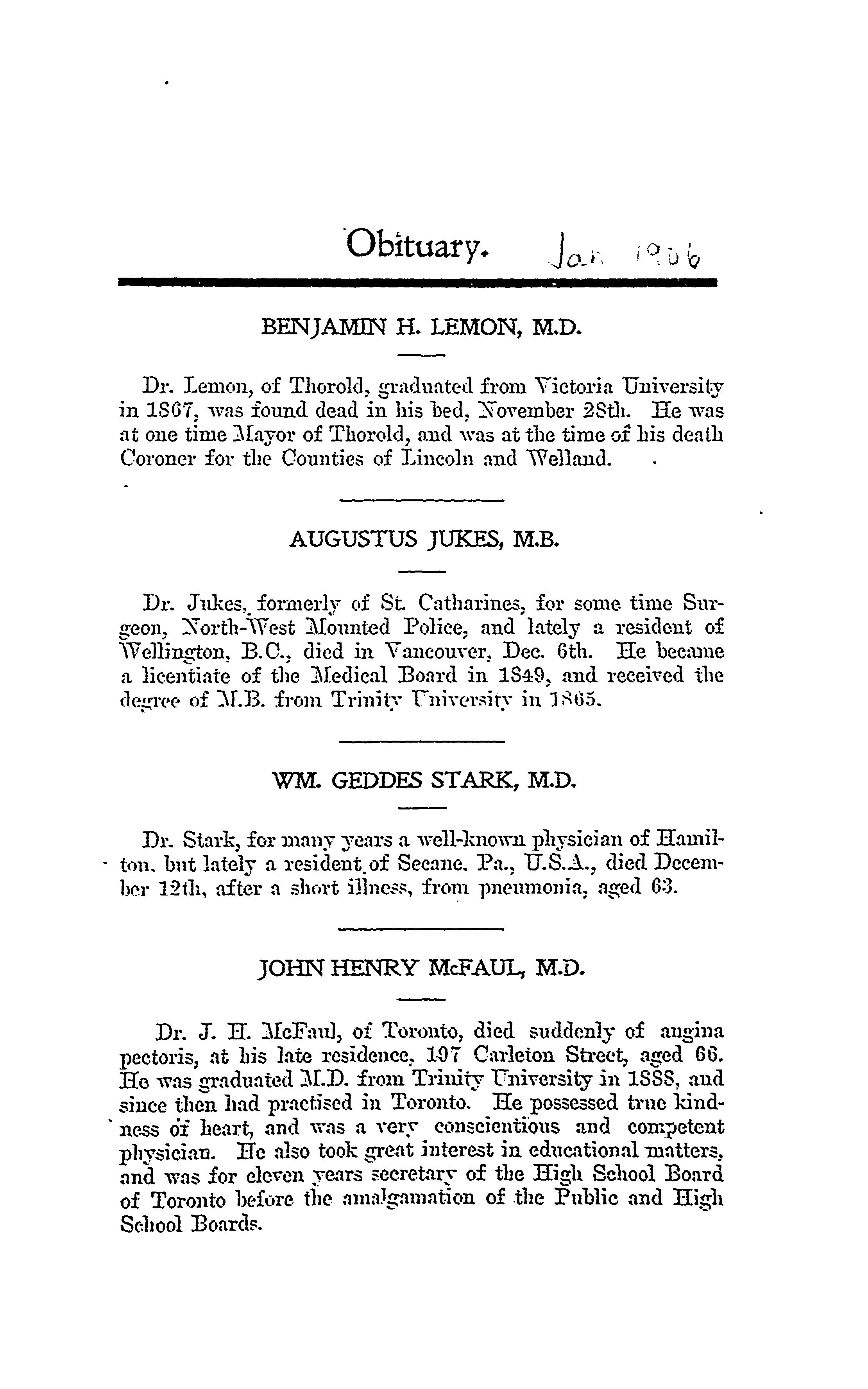 Toronto : Canadian Practitioner and Review Co., [1906]; 69 images avec recherche en texte intégral