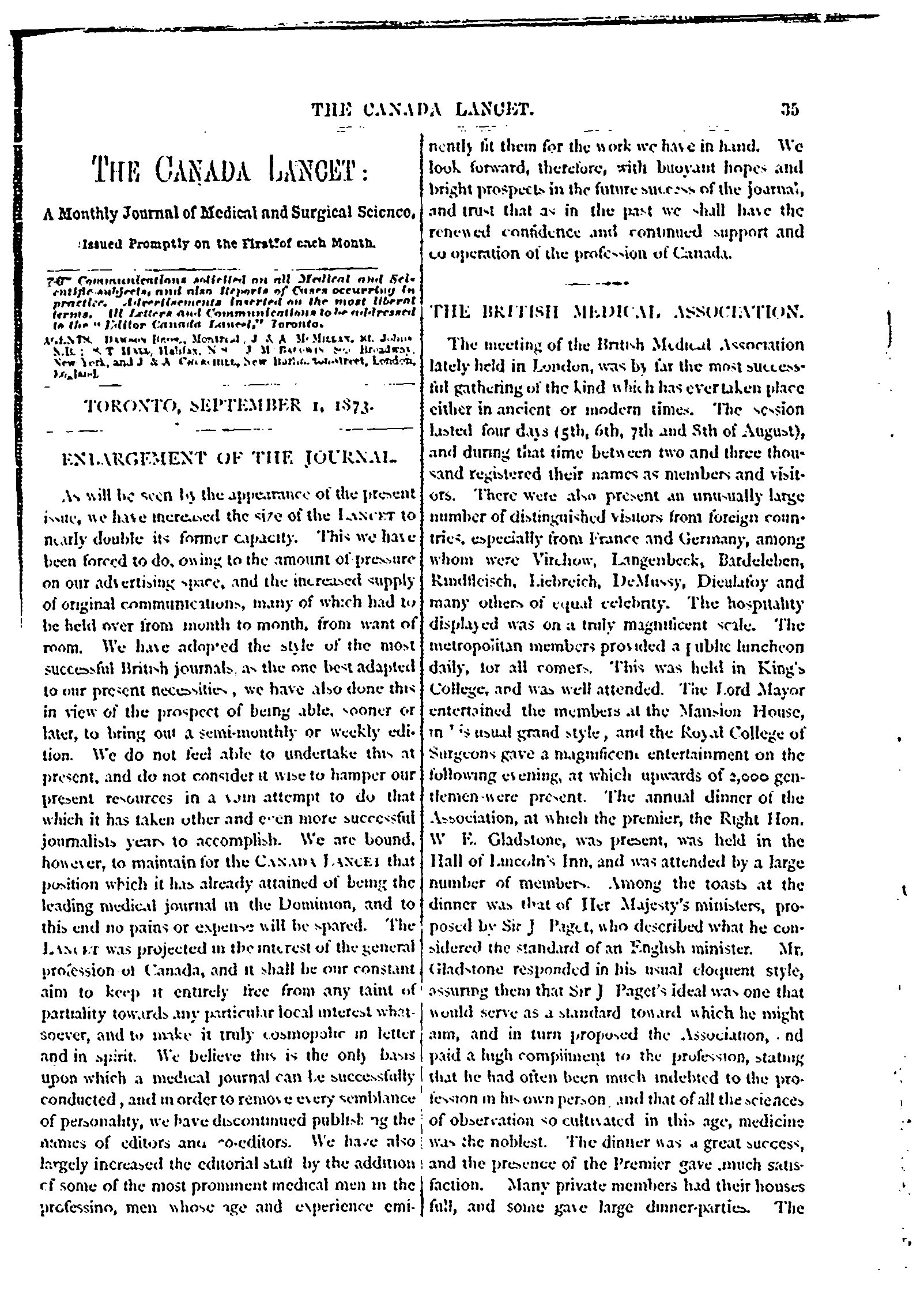 The Canada lancet : [Vol. 6, no. 1 (Sept. 1873)]